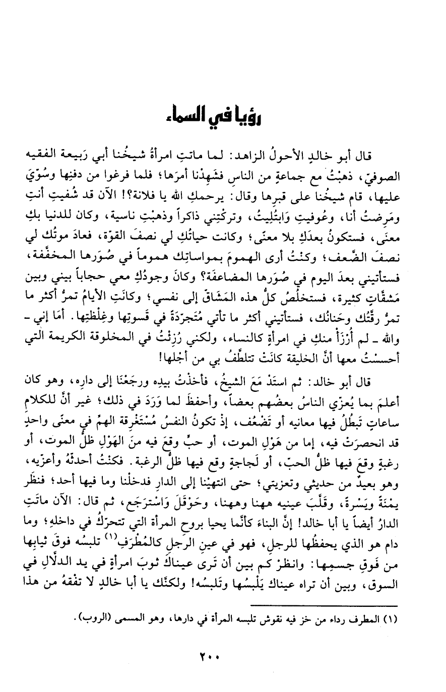قال أبو خالد: ثم استد مع الشيخ، فأخذت بيده ورجعنا إلى داره، وهو كان أعلم بما يعزي الناس بعضهم بعضًا، وأحفظ لما ورد في ذلك؛ غير أن للكلام ساعات تبطل فيها معانيه أو تضعف، إذ تكون النفس مستغرقة الهم في معنى واحد قد انحصرت فيه، إما من هول الموت، أو حب وقع فيه من الهول ظل الموت، أو رغبة وقع فيها ظل الحب، أو لجاجة وقع فيها ظل الرغبة. فكنت أحدثه وأعزيه، وهو بعيد من حديثي وتعزيتي؛ حتى انتهينا إلى الدار فدخلنا وما فيها أحد؛ فنظر يمنة ويسرة، وقلب عينيه ههنا وههنا، وحوقل واسترجع، ثم قال: الآن ماتت الدار أيضًا يا أبا خالد! إن البناء كأنما يحيا بروح المرأة التي تتحرك في داخله؛ وما دام هو الذي يحفظها للرجل، فهو في عين الرجل كالمُطْرَف1 تلبسه فوق ثيابها من فوق جسمها. وانظر كم بين أن ترى عيناك ثوب امرأة في يد الدلال في السوق، وبين أن تراه عيناك يلبسها وتلبسه! ولكنك يا أبا خالد لا تفقه من هذا