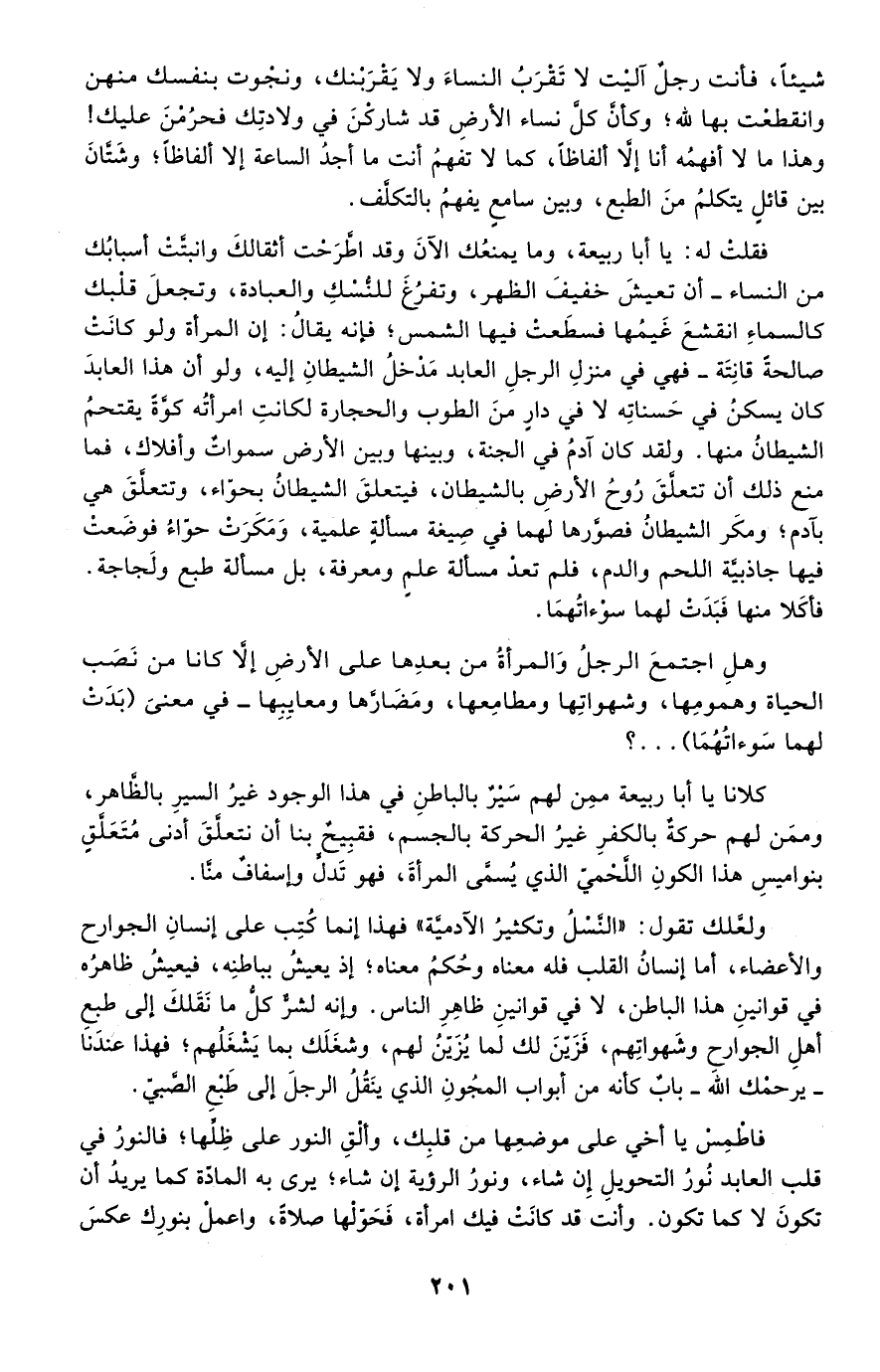 كلانا يا أبا ربيعة ممن لهم سَيْر بالباطن في هذا الوجود غير السير بالظاهر، وممن لهم حركة بالكفر غير الحركة بالجسم، فقبيحٌ بنا أن نتعلق أدنى متعلَّق بنواميس هذا الكون اللحمي الذي يسمى المرأة، فهو تَدَلٍّ وإسفاف منا.