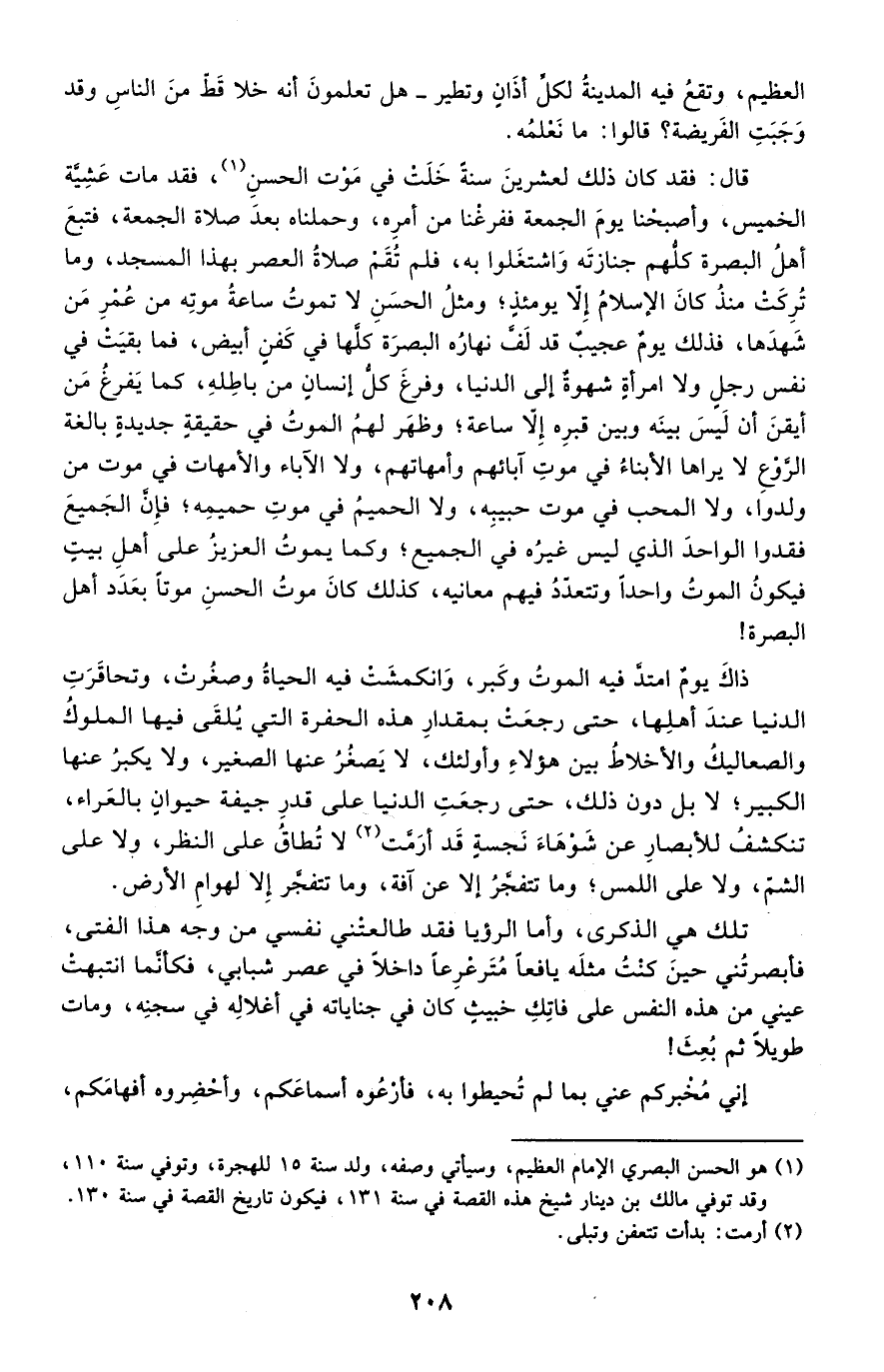 قال: فقد كان ذلك لعشرين سنة خلت في موت الحسن1، فقد مات عشية الخميس، وأصبحنا يوم الجمعة ففرغنا من أمره، وحملناه بعد صلاة الجمعة، فتبع أهل البصرة كلهم جنازته واشتغلوا به، فلم تُقَمْ صلاة العصر بهذا المسجد، وما تُرِكَتْ منذ كان الإسلام إلا يومئذ؛ ومثل الحسن لا تموت ساعة موته من عمر من شهدها، فذلك يوم عجيب قد لف نهاره البصرة كلها في كفن أبيض، فما بقيت في نفس رجل ولا امرأة شهوة إلى الدنيا، وفرغ كل إنسان من باطله، كما يفرغ من أيقن أن ليس بينه وبين قبره إلا ساعة؛ وظهر لهم الموت في حقيقة جديدة بالغة الروع لا يراها الأبناء في موت آبائهم وأمهاتهم، ولا الآباء والأمهات في موت من ولدوا، ولا المحب في موت حبيبه، ولا الحميم في موت حميمه؛ فإن الجميع فقدوا الواحد الذي ليس غيره في الجميع؛ وكما يموت العزيز على أهل بيت فيكون الموت واحدًا وتتعدد فيهم معانيه، كذلك كان موت الحسن موتًا بعدد أهل البصرة!