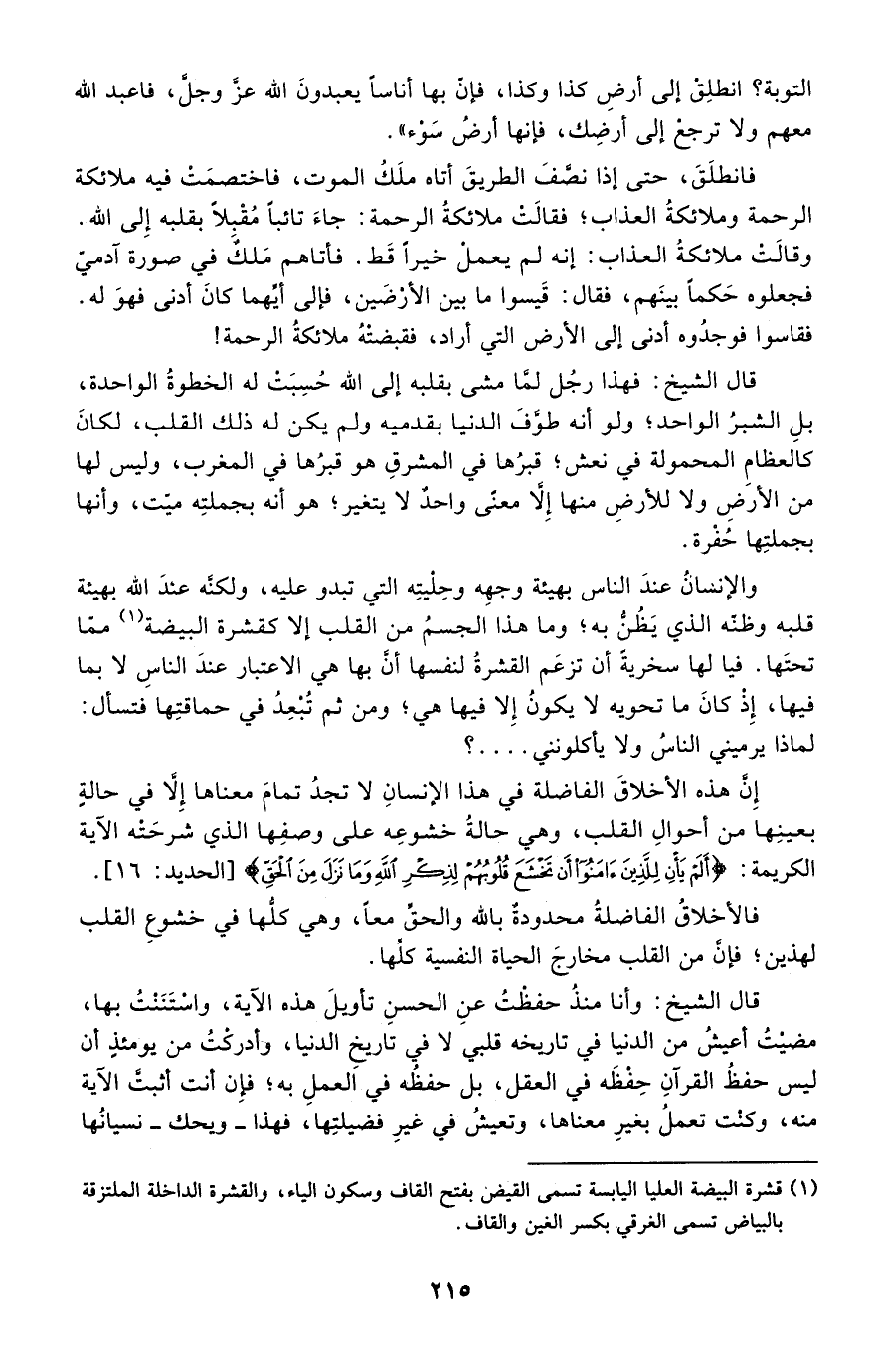قال الشيخ: فهذا رجل لما مشى بقلبه إلى الله حسبت له الخطوة الواحدة، بل الشبر الواحد؛ ولو أنه طوف الدنيا بقدميه ولم يكن له ذلك القلب، لكان كالعظام المحمولة في نعش؛ قبرها في المشرق هو قبرها في المغرب، وليس لها من الأرض ولا للأرض منها إلا معنى واحد لا يتغير؛ هو أنه بجملته ميت، وأنها بجملتها حفرة.