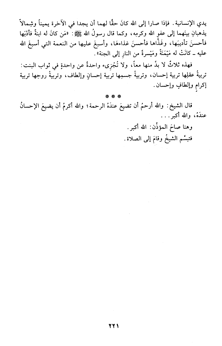 فهذه ثلاث لا بد منها معًا، ولا تجزئ واحدة عن واحدة في ثواب البنت: تربية عقلها تربية إحسان، وتربية جسمها تربية إحسان وإلطاف، وتربية روحها تربية إكرام وإلطاف وإحسان.