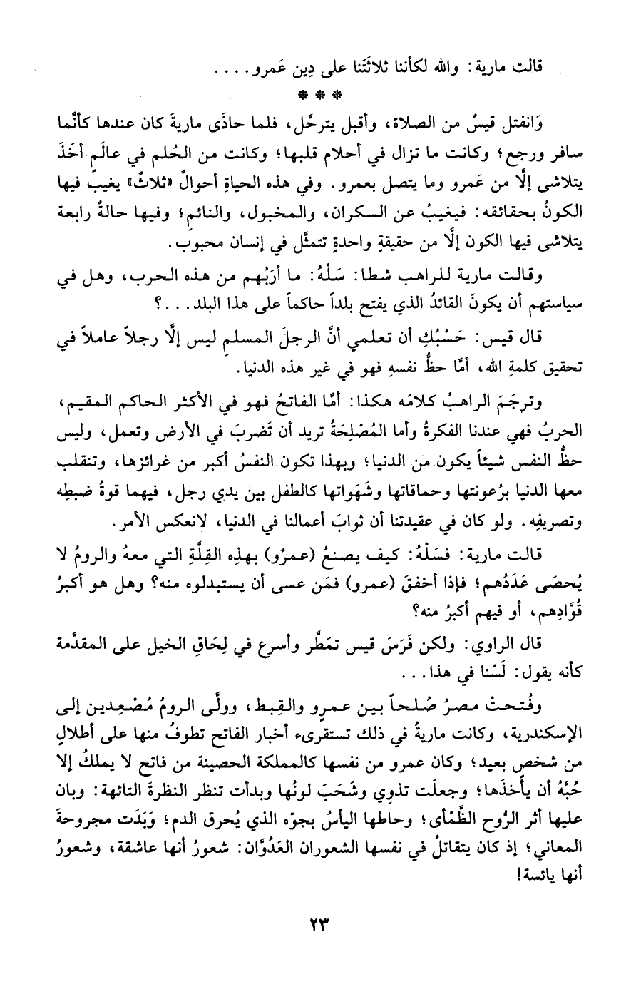 قال الراوي: ولكن فرس قيس تمطّر وأسرع في لحاق الخيل على المقدمة, كأنه يقول: لسنا في هذا. وفُتحت مصر صلحًا بين عمرو والقبط، وولى الروم مصعدين إلى الإسكندرية، وكانت مارية في ذلك تستقرئ أخبار الفاتح تطوف منها على أطلال من شخص بعيد؛ وكان عمرو من نفسها كالمملكة الحصينة من فاتح لا يملك إلا حبه أن يأخذها؛ وجعلت تذوي وشحب لونها وبدأت تنظر النظرة التائهة, وبان عليها أثر الروح الظمأى؛ وحاطها اليأس بجوِّه الذي يحرق الدم؛ وبدت مجروحة المعاني؛ إذ كان يتقاتل في نفسها الشعوران العدوان: شعور أنها عاشقة، وشعور أنها يائسة!