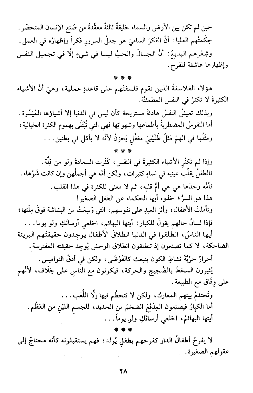 أيها الناس، انطلقوا في الدنيا انطلاق الأطفال يوجدون حقيقتهم البريئة الضاحكة، لا كما تصنعون إذ تنطلقون انطلاق الوحش يوجد حقيقته المفترسة.
