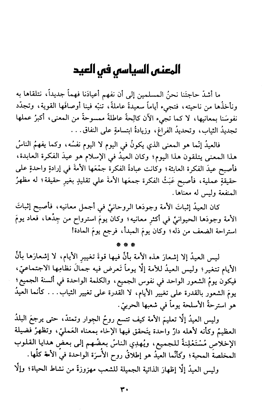 فالعيد إنما هو المعنى الذي يكون في اليوم لا اليوم نفسه، وكما يفهم الناس هذا المعنى يتلقون هذا اليوم؛ وكان العيد في الإسلام هو عيد الفكرة العابدة، فأصبح عيد الفكرة العابثة؛ وكانت عبادة الفكرة جمعها الأمة في إرادة واحدة على حقيقة عملية، فأصبح عبث الفكرة جمعها الأمة على تقليد بغير حقيقة؛ له مظهر المنفعة وليس له معناها.