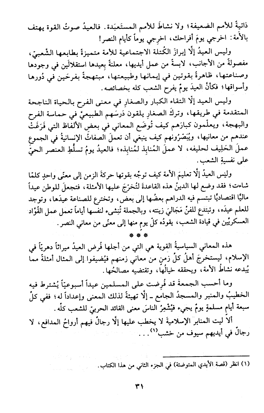 وليس العيد إلا إبراز الكتلة الاجتماعية للأمة متميزة بطابعها الشعبي، مفصولة من الأجانب، لابسة من عمل أيديها، معلنة بعيدها استقلالين في وجودها وصناعتها، ظاهرة بقوتين في إيمانها وطبيعتها، مبتهجة بفرحين في دورها وأسواقها؛ فكأن العيد يوم يفرح الشعب كله بخصائصه.