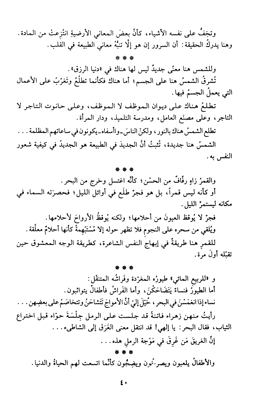 وتخف على نفسه الأشياء، كأن بعض المعاني الأرضية انتُزعت من المادة. وهنا يدرك الحقيقة: أن السرور إن هو إلا تنبه معاني الطبيعة في القلب.