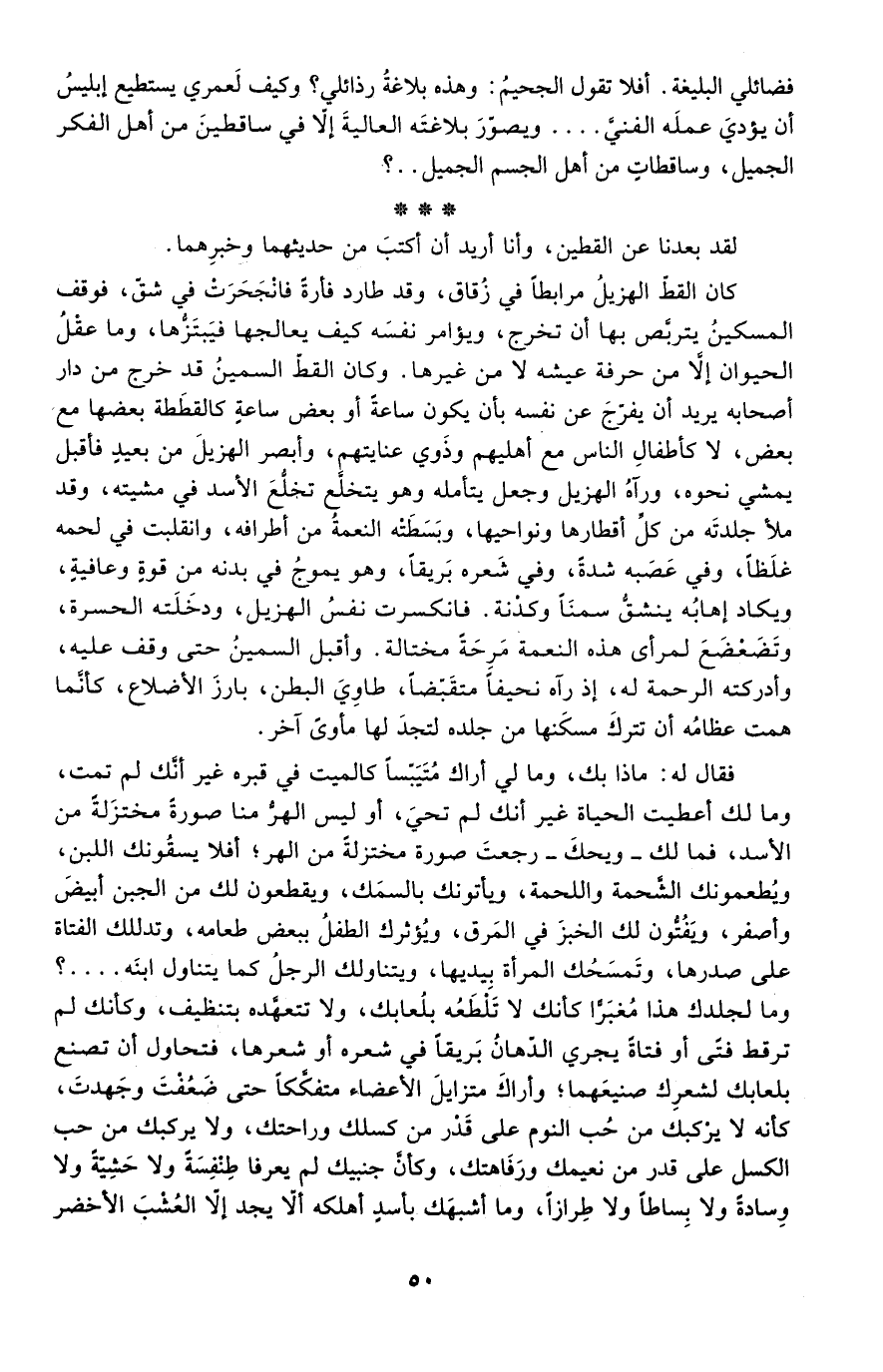 فقال له: ماذا بك، وما لي أراك متيبسًا كالميت في قبره غير أنك لم تمت، وما لك أعطيت الحياة غير أنك لم تحيَ، أوليس الهر منا صورة مختزلة من الأسد، فما لك -ويحك- رجعت صورة مختزلة من الهر؛ أفلا يسقونك اللبن، ويطعمونك الشحمة واللحمة، ويأتونك بالسمك، ويقطعون لك من الجبن أبيض وأصفر، ويفتّون لك الخبز في المرق، ويُؤثرك الطفل ببعض طعامه، وتدللك الفتاة على صدرها، وتمسحك المرأة بيديها، ويتناولك الرجل كما يتناول ابنه؟ وما لجلدك هذا مغبرًّا كأنك لا تلطعه بلعابك، ولا تتعهده بتنظيف، وكأنك لم تر قط فتى أو فتاة يجري الدهان بريقًا في شعره أو شعرها، فتحاول أن تصنع بلعابك لشعرك صنيعهما؛ وأراك متزايل الأعضاء متفككًا حتى ضعُفتَ وجهدتَ، كأنه لا يركبك من حب النوم على قدر من كسلك وراحتك، ولا يركبك من حب الكسل على قدر من نعيمك ورفاهتك، وكأن جنبيك لم يعرفا طِنْفِسة ولا حَشِيَّة ولا وسادة ولا بساطًا ولا طرازًا، وما أشبهك بأسد أهلكه ألا يجد إلا العشب الأخضر