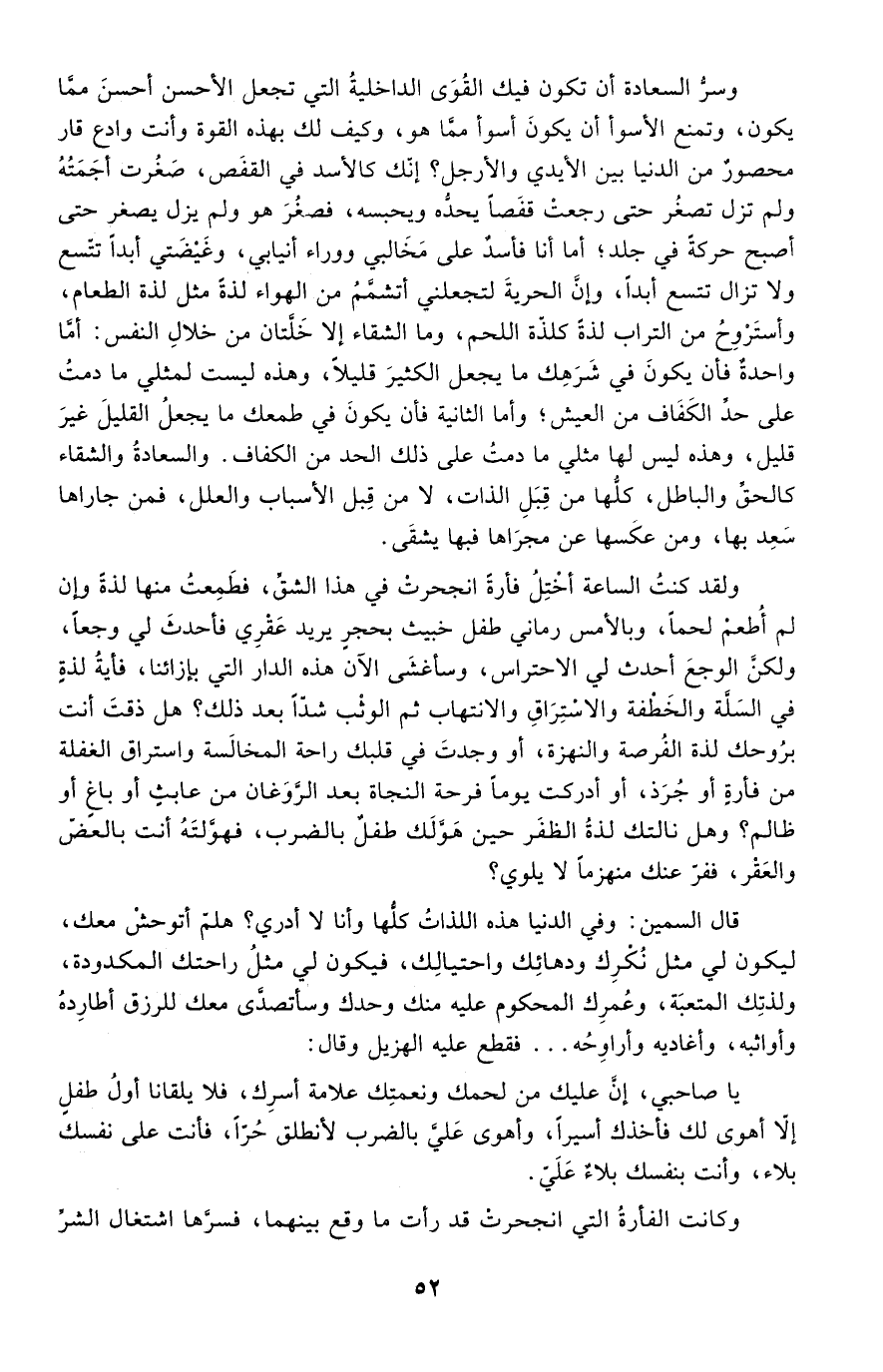 وسر السعادة أن تكون فيك القوى الداخلية التي تجعل الأحسن أحسن مما يكون، وتمنع الأسوأ أن يكون أسوأ مما هو، وكيف لك بهذه القوة وأنت وادع قار محصور من الدنيا بين الأيدي والأرجل؟ إنك كالأسد في القفص، صغُرت أَجَمَتُهُ ولم تزل تصغر حتى رجعت قفصًا يحده ويحبسه، فصغر هو ولم يزل يصغر حتى أصبح حركة في جلد؛ أما أنا فأسد على مخالبي ووراء أنيابي، وغَيْضَتي أبدًا تتسع ولا تزال تتسع أبدًا، وإن الحرية لتجعلني أتشمم من الهواء لذة مثل لذة الطعام، وأستروح من التراب لذة كلذة اللحم، وما الشقاء إلا خَلَّتان من خلال النفس: أما واحدة فأن يكون في شرهك ما يجعل الكثير قليلًا، وهذه ليست لمثلي ما دمت على حد الكَفَاف من العيش؛ وأما الثانية فأن يكون في طمعك ما يجعل القليل غير قليل، وهذه ليس لها مثلي ما دمتُ على ذلك الحد من الكفاف. والسعادة والشقاء كالحق والباطل، كلها من قِبَل الذات، لا من قبل الأسباب والعلل، فمن جاراها سَعِد بها، ومن عكسها عن مجراها فبها يشقَى.