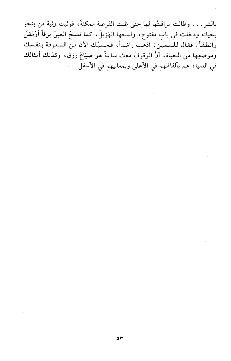 بالشر. وطالت مراقبتها لها حتى ظنت الفرصة ممكنة، فوثبت وثبة من ينجو بحياته ودخلت في باب مفتوح، ولمحها الهزيل، كما تلمح العين برقًا أومض وانطفأ. فقال للسمين: اذهب راشدًا، فحسبك الآن من المعرفة بنفسك وموضعها من الحياة، أن الوقوف معك ساعة هو ضياع رزق، وكذلك أمثالك في الدنيا، هم بألفاظهم في الأعلى وبمعانيهم في الأسفل.