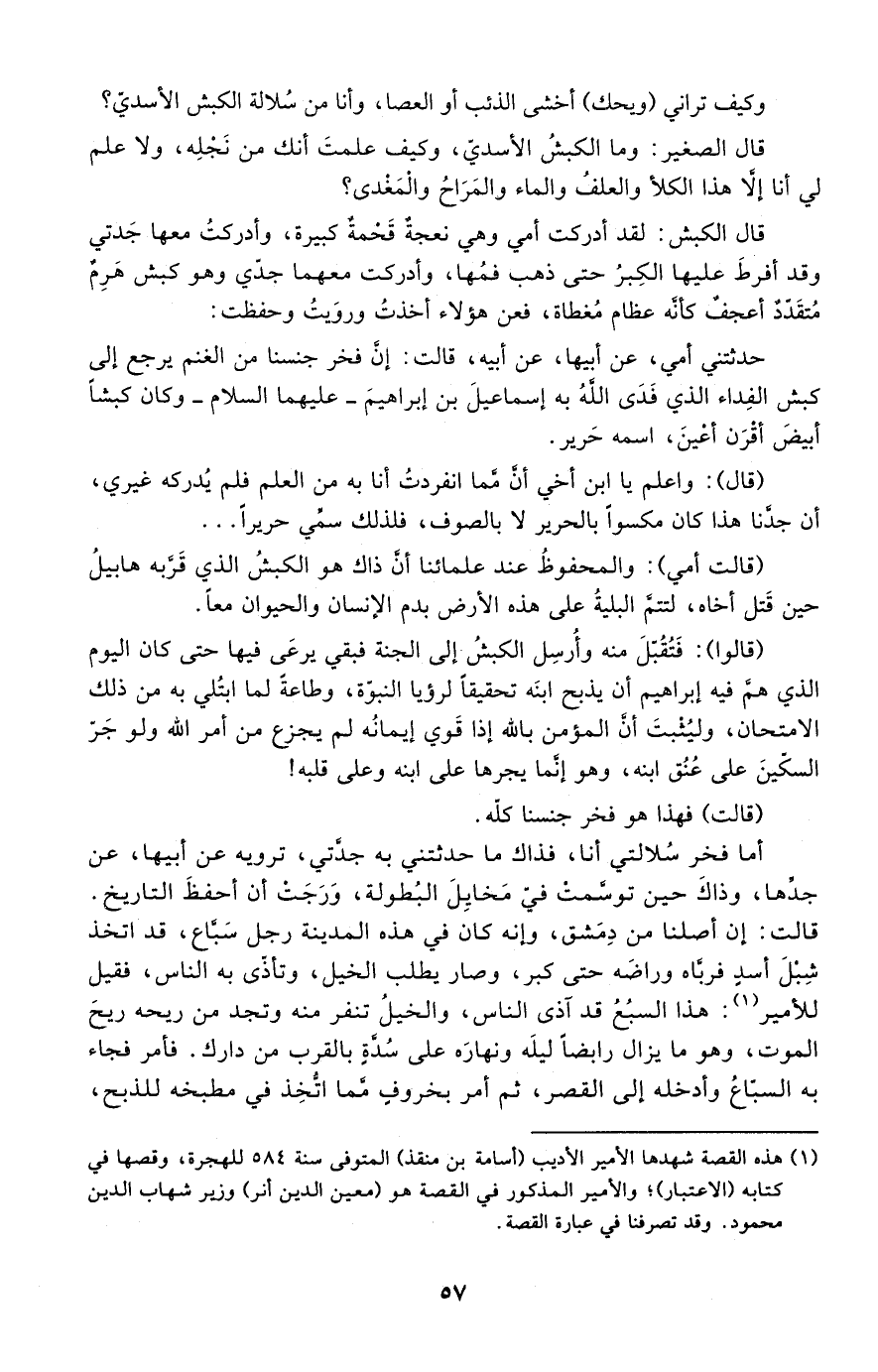 1 هذه القصة شهدها الأمير الأديب "أسامة بن منقذ" المتوفى سنة 584 للهجرة، وقصها في كتابه "الاعتبار"؛ والأمير المذكور في القصة هو "معين الدين أنر" وزير شهاب الدين محمود. وقد تصرفنا في عبارة القصة.