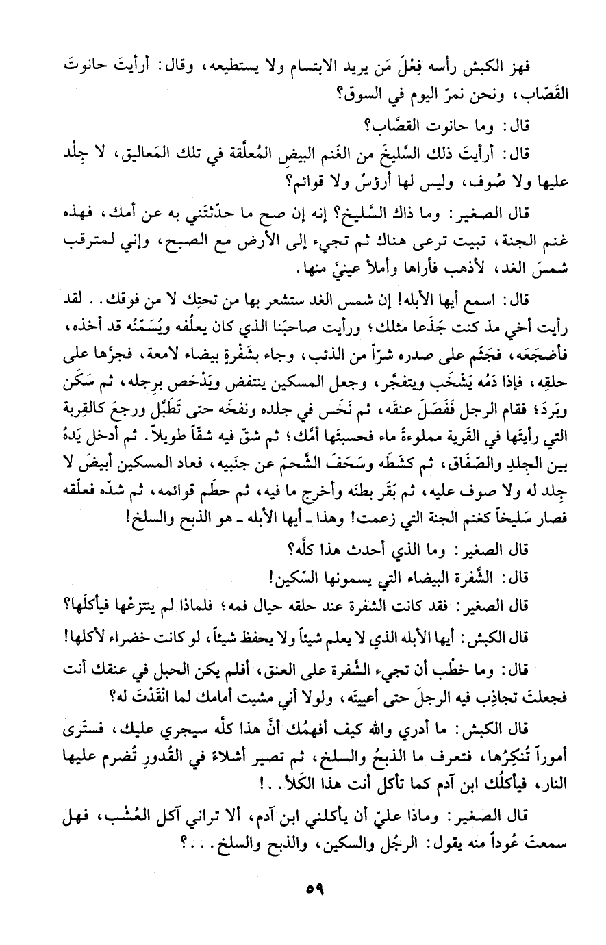 قال: اسمع أيها الأبله! إن شمس الغد ستشعر بها من تحتك لا من فوقك. لقد رأيت أخي مذ كنت جذعًا مثلك؛ ورأيت صاحبنا الذي كان يعلفه ويسمنه قد أخذه، فأضجعه، فجثم على صدره شرا من الذئب، وجاء بشفرة بيضاء لامعة، فجرها على حلقه، فإذا دمه يسخب ويتفجر، وجعل المسكين ينتفض ويَدْحَص برجليه، ثم سكن وبَردَ؛ فقام الرجل ففصل عنقه، ثم نخس في جلده ونفخه حتى تطبل ورجع كالقِربة التي رأيتها في القرية مملوءة ماء فحسبتها أمك؛ ثم شق فيه شقًّا طويلًا. ثم أدخل يده بين الجلد والصفاق، ثم كشطه وسَحَف الشحم عن جنبيه، فعاد المسكين أبيض لا جلد له ولا صوف عليه، ثم بقر بطنه وأخرج ما فيه، ثم حطم قوائمه، ثم شده فعلقه فصار سليخًا كغنم الجنة التي زعمت! وهذا -أيها الأبله- هو الذبح والسلخ!