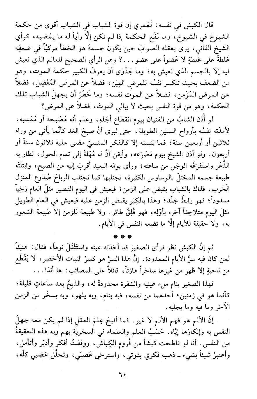 إن الألم هو فهم الألم لا غير. فما أقبح علم العقل إذا لم يكن معه جهل النفس به وإنكارها إياه. حسب العلم والعلماء في السخرية بهم وبه هذه الحقيقة من النفس. أنا لو ناطحت كبشًا من قُروم الكباش، ووقفت أفكر وأدبر وأتأمل، وأعتبر شيئًا بشيء؛ ذهب فكري بقوتي، واسترخى عصبي، وتحلل غضبي كله،
