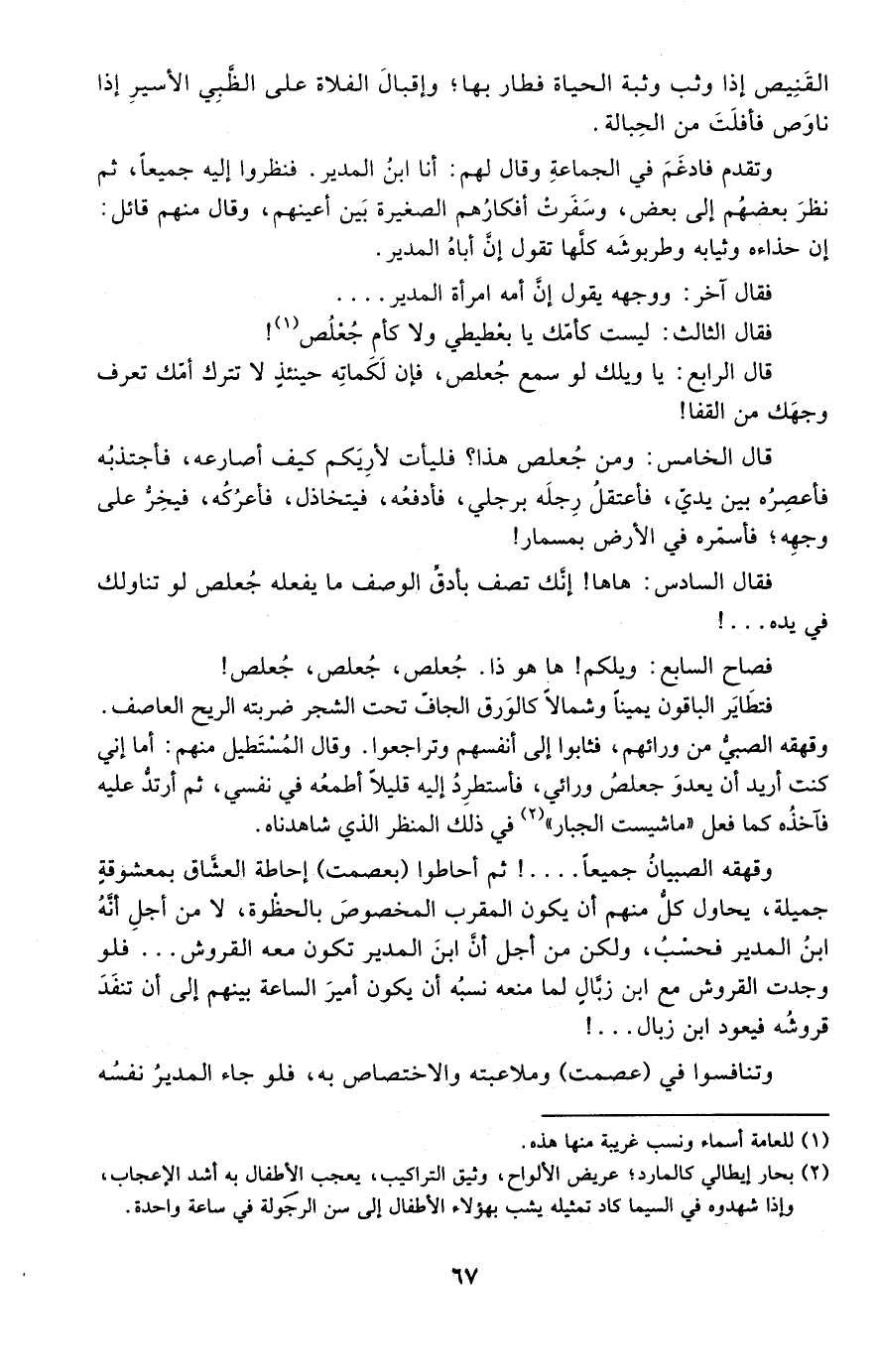 فتطاير الباقون يمينًا وشمالًا كالورق الجاف تحت الشجر ضربته الريح العاصف, وقهقه الصبي من ورائهم، فثابوا إلى أنفسهم وتراجعوا. وقال المستطيل منهم: أما أني كنت أريد أن يعدو جعلص ورائي، فأستطرد إليه قليلًا أطمعه في نفسي، ثم أرتد عليه فآخذه كما فعل "ماشيست الجبار"2 في ذلك المنظر الذي شاهدناه.
