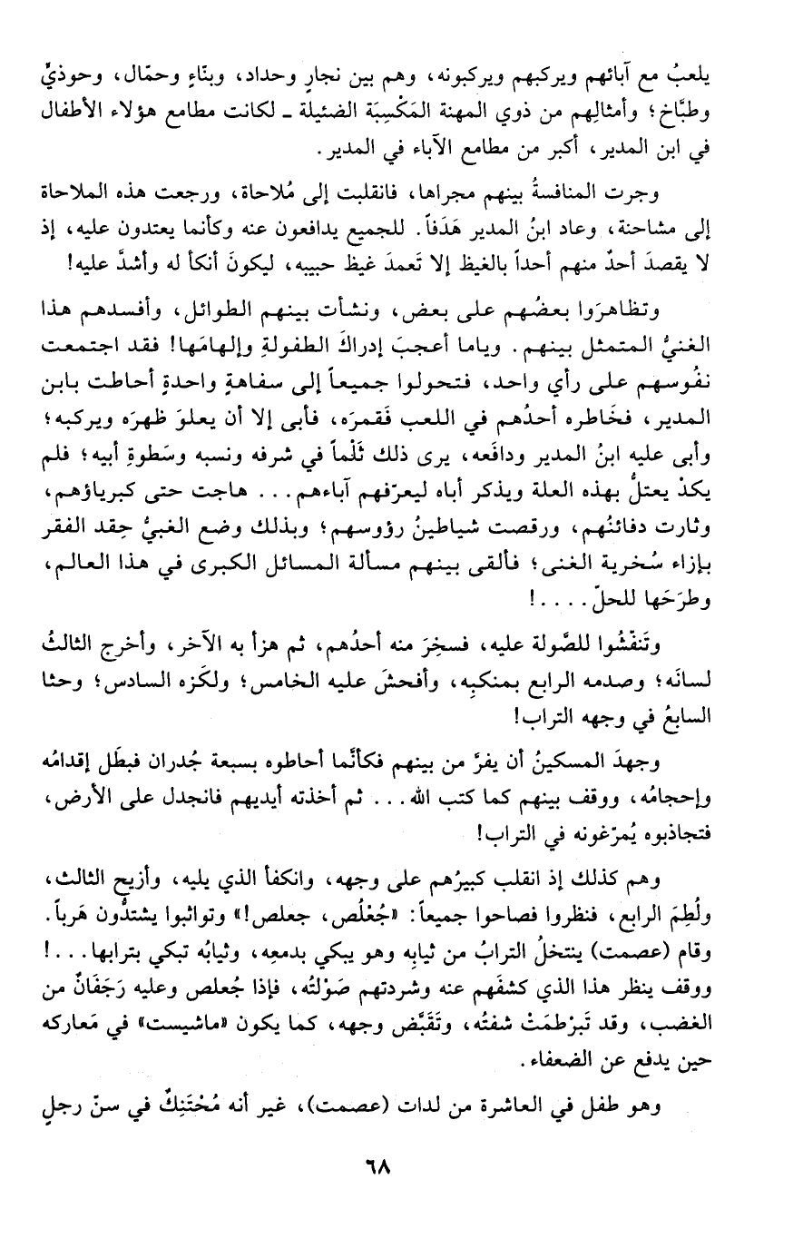 وتظاهروا بعضهم على بعض، ونشأت بينهم الطوائل، وأفسدهم هذا الغني المتمثل بينهم. ويا ما أعجب إدراك الطفولة وإلهامها! فقد اجتمعت نفوسهم على رأي واحد، فتحولوا جميعًا إلى سفاهة واحدة أحاطت بابن المدير، فخاطره أحدهم في اللعب فقمره، فأبى إلا أن يعلو ظهره ويركبه؛ وأبى عليه ابن المدير ودافعه، يرى ذلك ثَلْمًا في شرفه ونسبه وسطوة أبيه؛ فلم يكد يعتل بهذه العلة ويذكر أباه ليعرفهم آباءهم, هاجت حتى كبرياؤهم، وثارت دفائنهم، ورقصت شياطين رءوسهم؛ وبذلك وضع الغبي حقد الفقر بإزاء سخرية الغنى؛ فألقى بينهم مسألة المسائل الكبرى في هذا العالم وطرحها للحل!