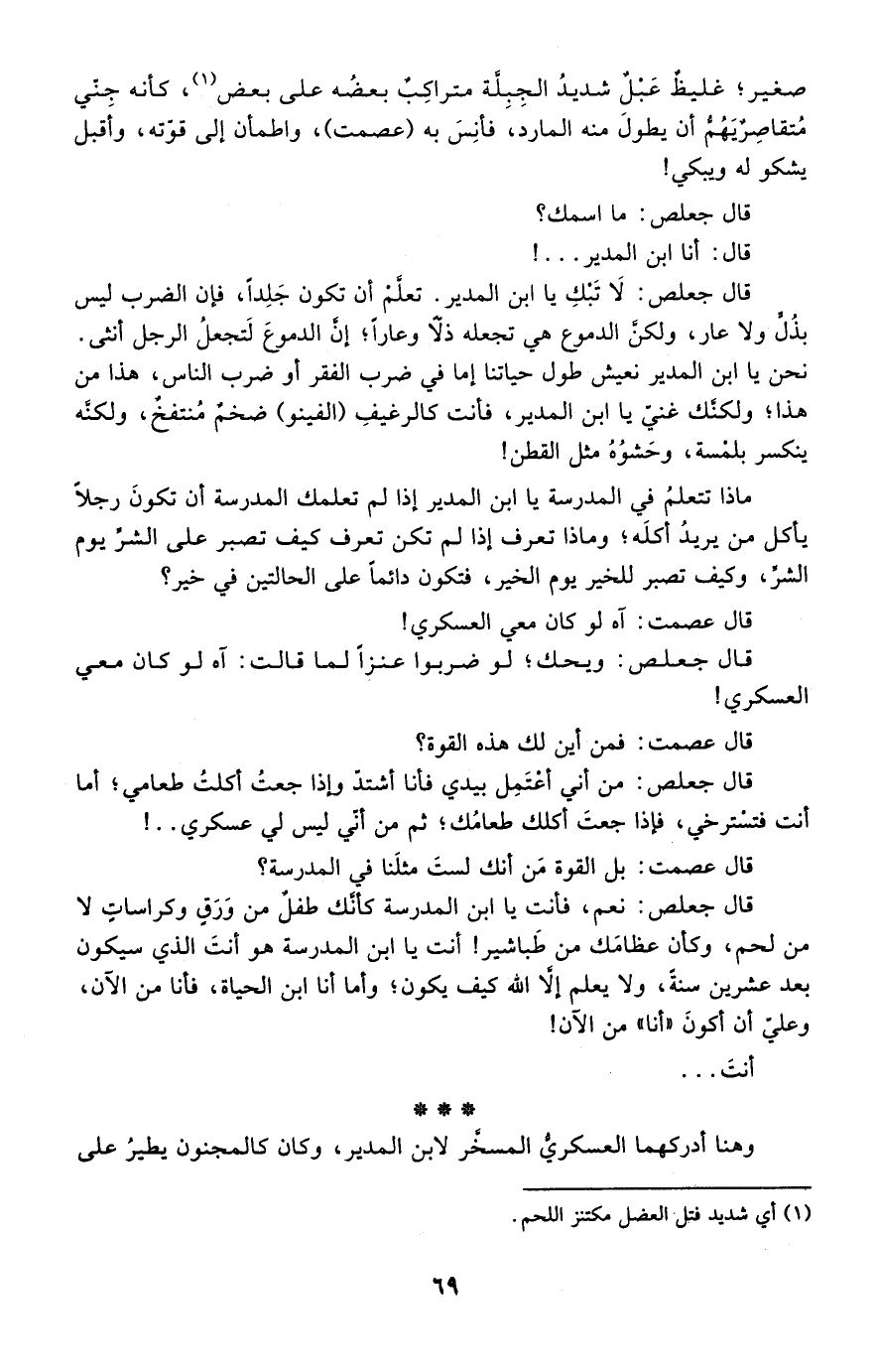 قال جعلص: لا تبك يابن المدير. تعلم أن تكون جلدًا، فإن الضرب ليس بذُل ولا عار، ولكن الدموع هي تجعله ذلًّا وعارًا؛ إن الدموع لتجعل الرجل أنثى. نحن يابن المدير نعيش طول حياتنا إما في ضرب الفقر أو ضرب الناس، هذا من هذا؛ ولكنك غني يابن المدير، فأنت كالرغيف "الفينو" ضخم منتفخ، ولكنه ينكسر بلمسة، وحشوه مثل القطن!