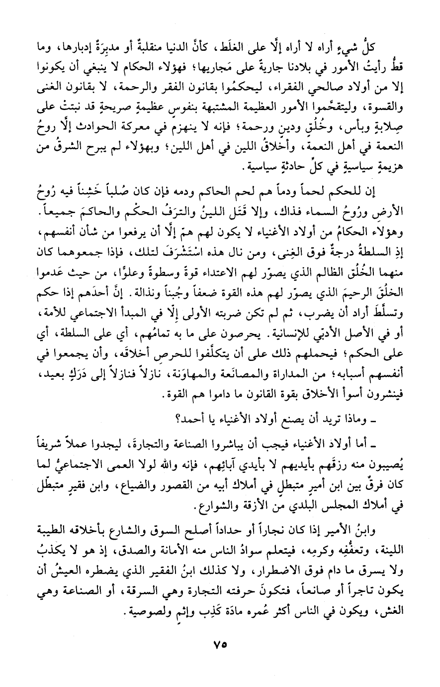 وابن الأمير إذا كان نجارًا أو حدادًا أصلح السوق والشارع بأخلاقه الطيبة اللينة، وتعففه وكرمه، فيتعلم سواد الناس منه الأمانة والصدق، إذ هو لا يكذب ولا يسرق ما دام فوق الاضطرار، ولا كذلك ابن الفقير الذي يضطره العيش أن يكون تاجرًا أو صانعًا، فتكون حرفته التجارة وهي السرقة، أو الصناعة وهي الغش، ويكون في الناس أكثر عمره مادة كذب وإثم ولصوصية.