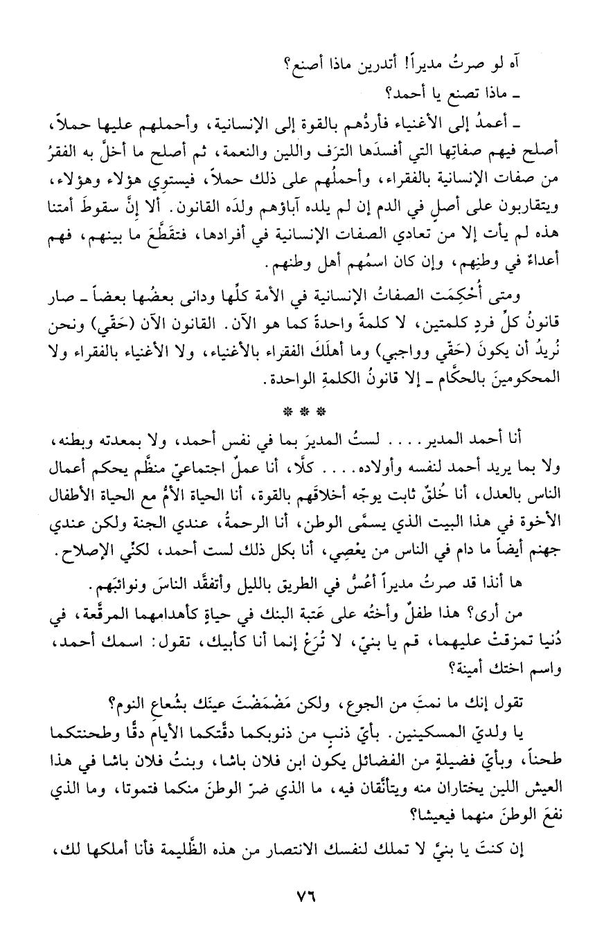 أنا أحمد المدير, لست المدير بما في نفس أحمد، ولا بمعدته وبطنه، ولا بما يريد أحمد لنفسه وأولاده, كلا، أنا عمل اجتماعي منظم يحكم أعمال الناس بالعدل، أنا خُلُق ثابت يوجه أخلاقهم بالقوة، أنا الحياة الأم مع الحياة الأطفال الأخوة في هذا البيت الذي يسمى الوطن، أنا الرحمة, عندي الجنة ولكن عندي جهنم أيضًا ما دام في الناس من يعصي، أنا بكل ذلك لست أحمد، لكني الإصلاح.