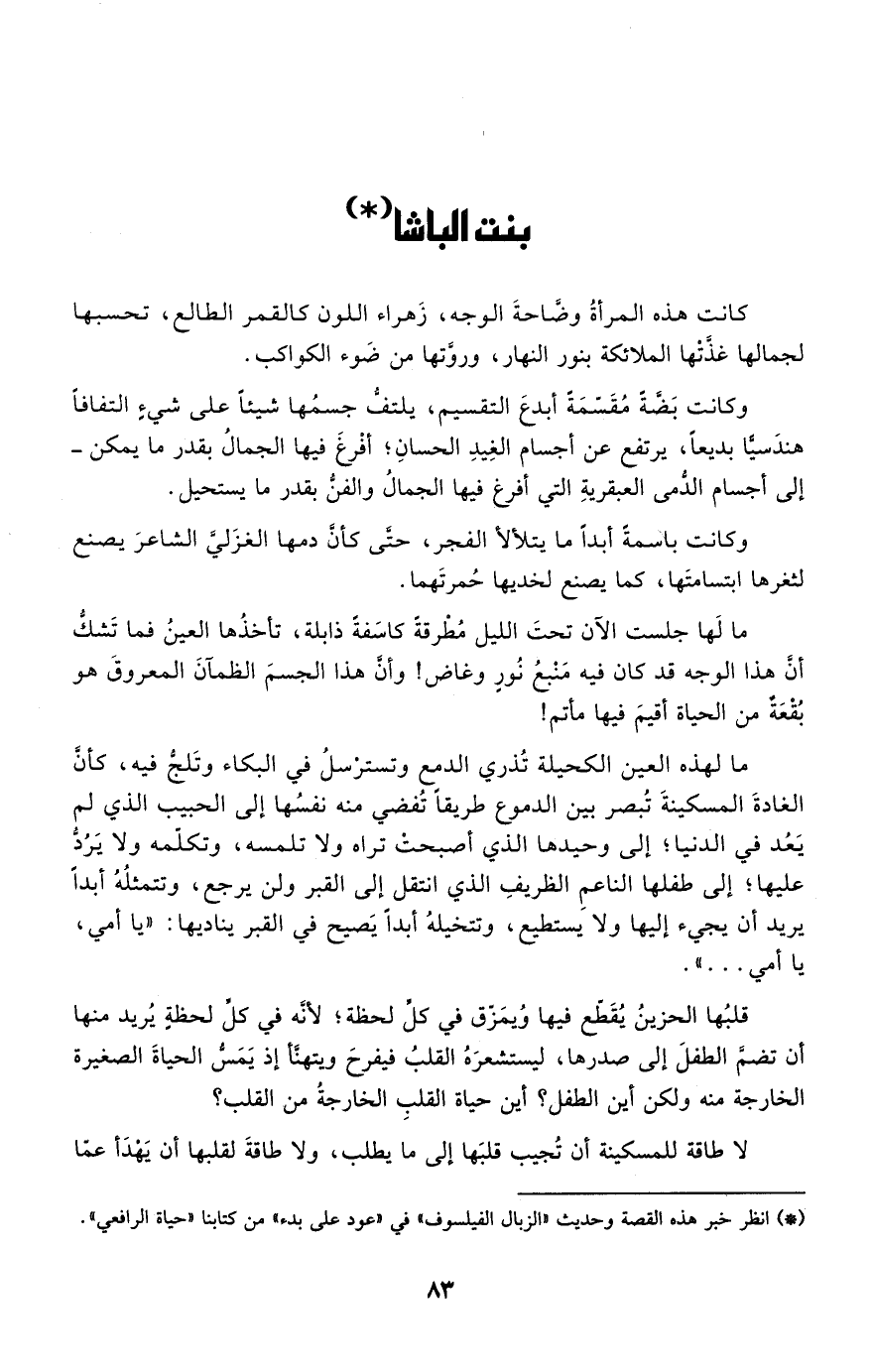 ما لهذه العين الكحيلة تُذري الدمع وتسترسل في البكاء وتلج فيه، كأن الغادة المسكينة تبصر بين الدموع طريقًا تفضي منه نفسها إلى الحبيب الذي لم يعد في الدنيا؛ إلى وحيدها الذي أصبحت تراه ولا تلمسه، وتكلمه ولا يرد عليها؛ إلى طفلها الناعم الظريف الذي انتقل إلى القبر ولن يرجع، وتتمثله أبدًا يريد أن يجيء إليها ولا يستطيع، وتتخيله أبدًا يصيح في القبر يناديها: "يا أمي، يا أمي".