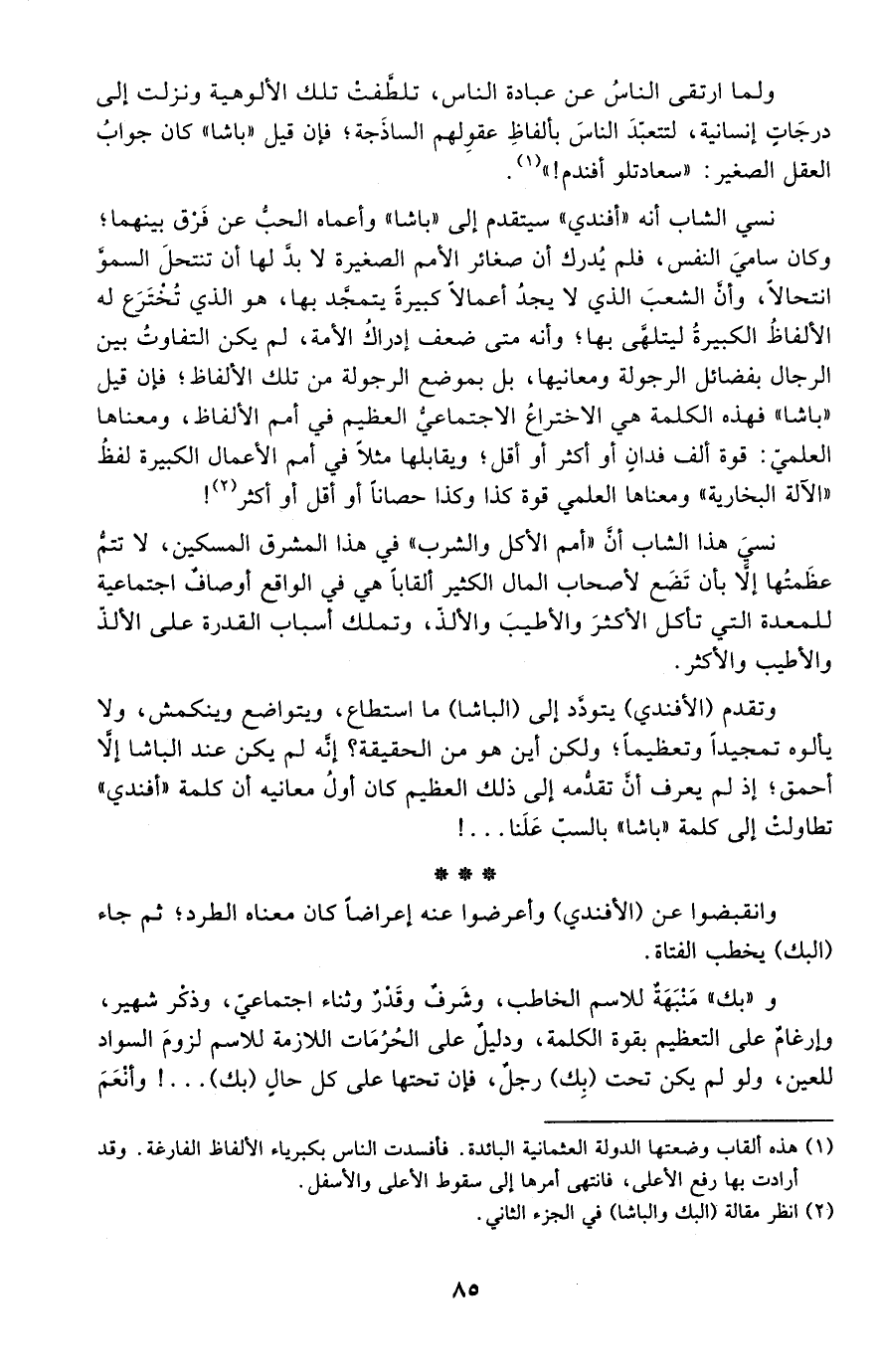 ولما ارتقى الناس عن عبادة الناس، تلطفت تلك الألوهية ونزلت إلى درجات إنسانية، لتتعبد الناس بألفاظ عقولهم الساذجة؛ فإن قيل "باشا" كان جواب العقل الصغير: "سعادتلو أفندم! "1.