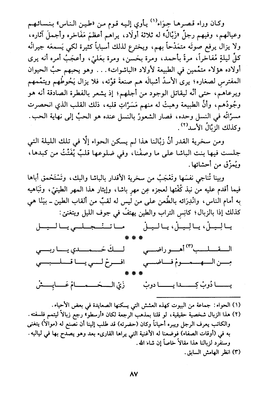وكان وراء قصرها حِوَاء1 يأوي إليه قوم من "طين الناس" بنسائهم وعيالهم، وفيهم رجل "زبال" له ثلاثة أولاد، يراهم أعظم مفاخره وأجمل آثاره، ولا يزال يرفع صوته متمدحا بهم, ويخترع لذلك أسبابا كثيرة لكي يسمعه جيرانه كل ليلة مفاخرًا، مرة بأحمد، ومرة بحسن، ومرة بعلي، وأعجب أمره أنه يرى أولاده هؤلاء متممين في الطبيعة لأولاد "الباشوات". وهو يحبهم حب الحيوان المفترس لصغاره؛ يرى الأسد أشباله هم صنعة قوته، فلا يزال يحوطهم ويتممهم ويرعاهم، حتى إنه ليقاتل الوجود من أجلهم؛ إذ يشعر بالفطرة الصادقة أنه هو وجودهم، وأن الطبيعة وهبت له منهم مسرات قلبه، ذلك القلب الذي انحصرت مسراته في النسل وحده، فصار الشعور بالنسل عنده هو الحب إلى نهاية الحب, وكذلك الزبال الأسد2.