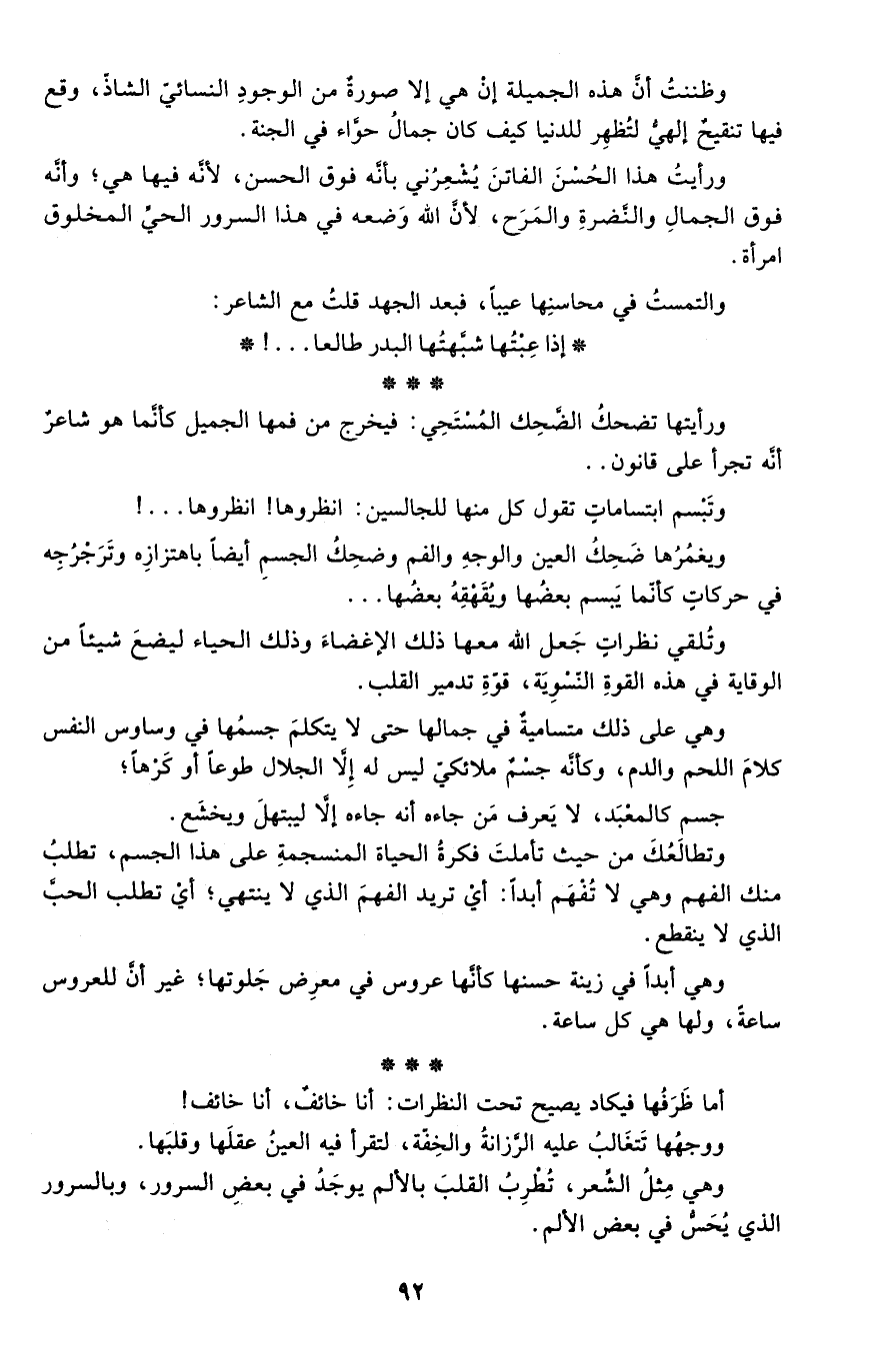 ورأيت هذا الحسن الفاتن يشعرني بأنه فوق الحسن؛ لأنه فيها هي؛ وأنه فوق الجمال والنضرة والمرح؛ لأن الله وضعه في هذا السرور الحي المخلوق امرأة.