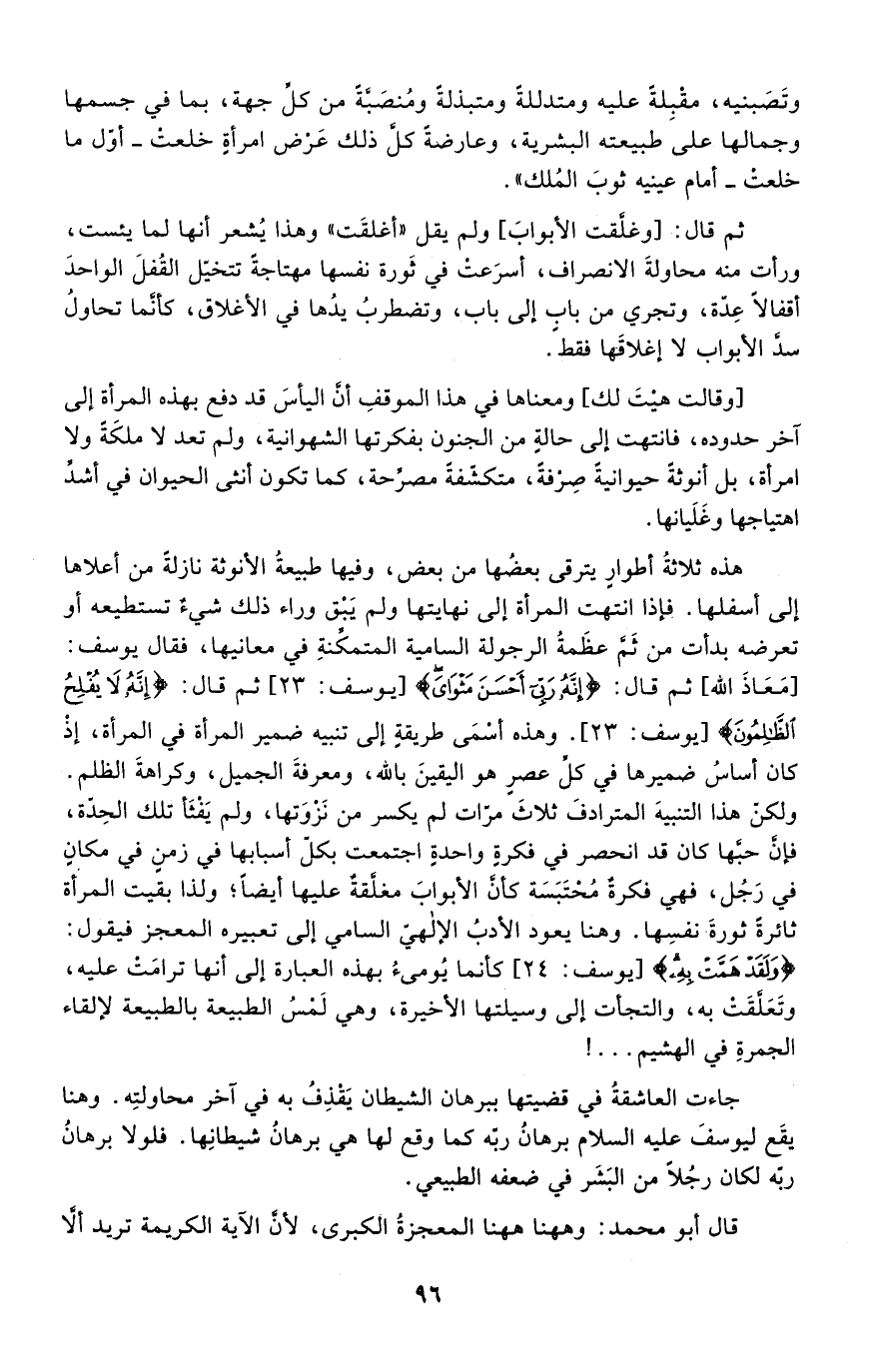 هذه ثلاثة أطوار يترقى بعضها من بعض، وفيها طبيعة الأنوثة نازلة من أعلاها إلى أسفلها. فإذا انتهت المرأة إلى نهايتها ولم يبق وراء ذلك شيء تستطيعه أو تعرضه بدأت من ثم عظمة الرجولة السامية المتمكنة في معانيها، فقال يوسف: {مَعَاذَ اللَّهِ} ثم قال: {إِنَّهُ رَبِّي أَحْسَنَ مَثْوَايَ} [يوسف: 23] ثم قال: {إِنَّهُ لَا يُفْلِحُ الظَّالِمُونَ} [يوسف: 23] . وهذه أسمى طريقة إلى تنبيه ضمير المرأة في المرأة، إذ كان أساس ضميرها في كل عصر هو اليقين بالله، ومعرفة الجميل، وكراهة الظلم. ولكن هذا التنبيه المترادف ثلاث مرات لم يكسر من نزوتها، ولم يَفْثَأ تلك الحدة، فإن حبها كان قد انحصر في فكرة واحدة اجتمعت بكل أسبابها في زمن, في مكان, في رجل. فهي فكرة محتبسة كأن الأبواب مغلقة عليها أيضًا؛ ولذا بقيت المرأة ثائرة ثورة نفسها. وهنا يعود الأدب الإلهي السامي إلى تعبيره المعجز فيقول: {وَلَقَدْ هَمَّتْ بِهِ} [يوسف: 24] كأنما يومئ بهذه العبارة إلى أنها ترامت عليه، وتعلقت به، والتجأت إلى وسيلتها الأخيرة، وهي لمس الطبيعة بالطبيعة لإلقاء الجمرة في الهشيم!