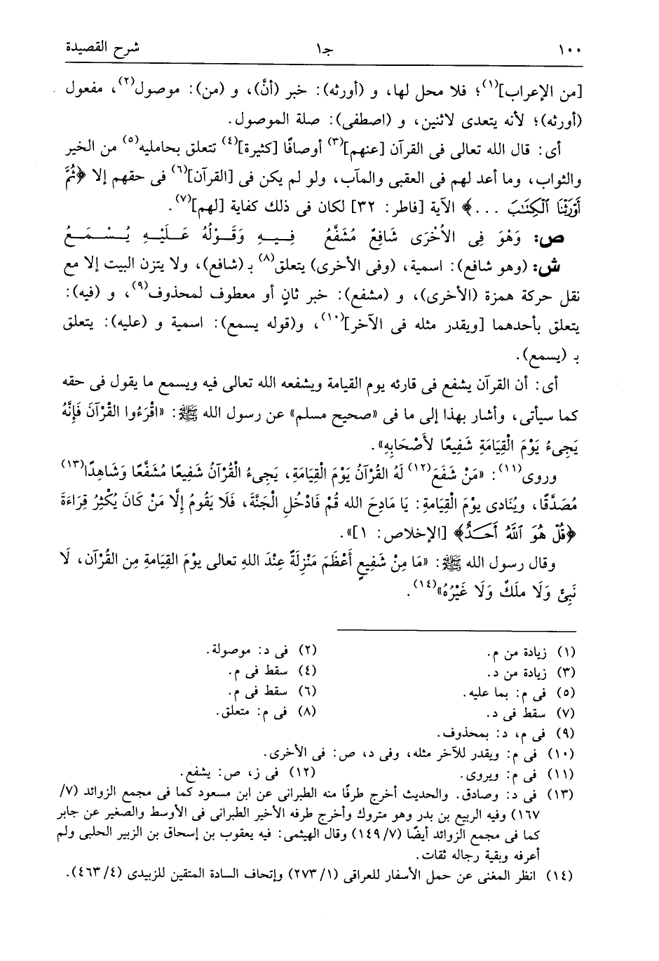 ش: (وهو شافع): اسمية، (وفى الأخرى) يتعلق (¬8) ب (شافع)، ولا يتزن البيت إلا مع نقل حركة همزة (الأخرى)، و (مشفع): خبر ثان أو معطوف لمحذوف (¬9)، و (فيه):