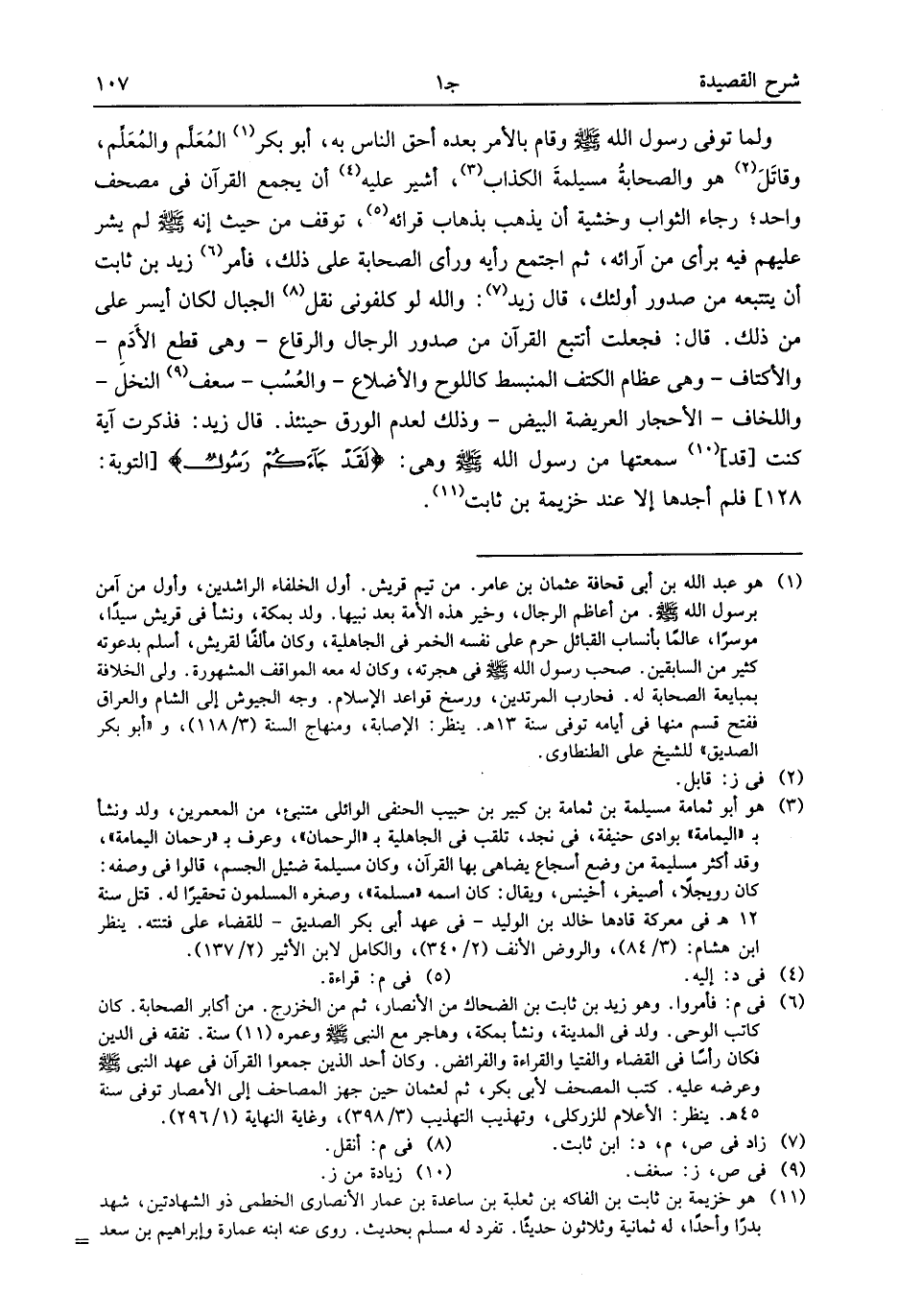 (¬6) فى م: فأمروا. وهو زيد بن ثابت بن الضحاك من الأنصار، ثم من الخزرج. من أكابر الصحابة. كان كاتب الوحى. ولد فى المدينة، ونشأ بمكة، وهاجر مع النبى صلى الله عليه وسلم وعمره (11) سنة. تفقه فى الدين فكان رأسا فى القضاء والفتيا والقراءة والفرائض. وكان أحد الذين جمعوا القرآن فى عهد النبى صلى الله عليه وسلم وعرضه عليه. كتب المصحف لأبى بكر، ثم لعثمان حين جهز المصاحف إلى الأمصار توفى سنة 45 هـ. ينظر: الأعلام للزركلى، وتهذيب التهذيب (3/ 398)، وغاية النهاية (1/ 296).