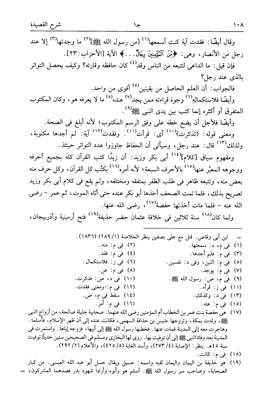 وأيضا فلاستكماله (¬6) وجوه قراءته ممن يجد (¬7) عنده (¬8) ما لا يعرفه هو، وكان المكتوب المتفرق أو أكثره إنما كتب بين يدى النبى صلى الله عليه وسلم (¬9).