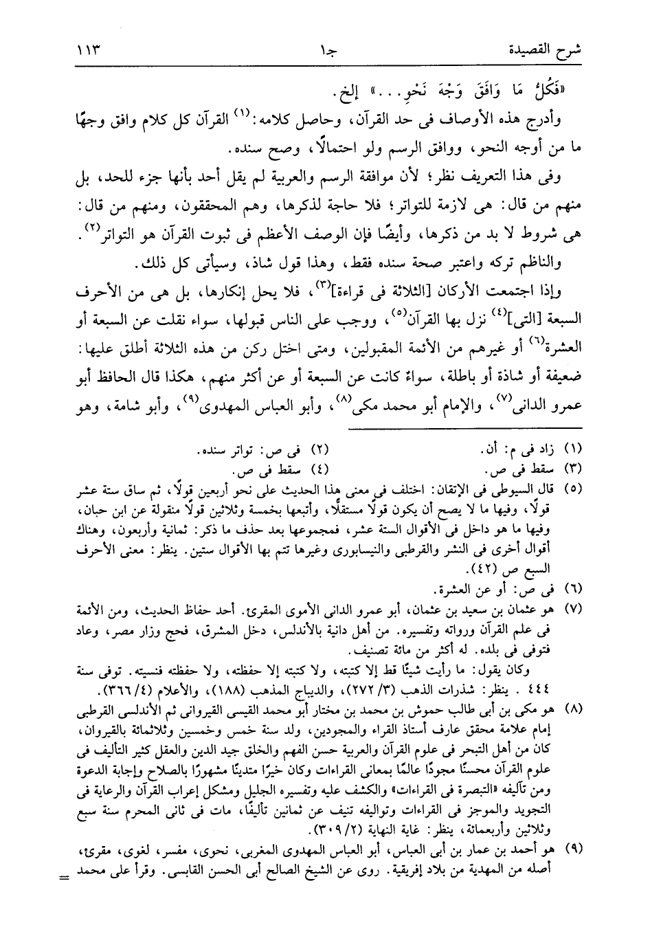 (¬7) هو عثمان بن سعيد بن عثمان، أبو عمرو الدانى الأموى المقرئ. أحد حفاظ الحديث، ومن الأئمة فى علم القرآن ورواته وتفسيره. من أهل دانية بالأندلس، دخل المشرق، فحج وزار مصر، وعاد فتوفى فى بلده. له أكثر من مائة تصنيف.