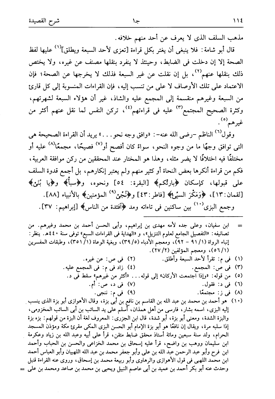قال أبو شامة: فلا ينبغى أن يغتر بكل قراءة [تعزى لأحد السبعة ويطلق] (¬1) عليها لفظ الصحة إلا إن دخلت فى الضابط، وحينئذ لا ينفرد بنقلها مصنف عن غيره، ولا يختص ذلك بنقلها عنهم (¬2)، بل إن نقلت عن غير السبعة فذلك لا يخرجها عن الصحة؛ فإن الاعتماد على تلك الأوصاف لا على من تنسب إليه، فإن القراءات المنسوبة إلى كل قارئ من السبعة وغيرهم منقسمة إلى المجمع عليه والشاذ، غير أن هؤلاء السبعة لشهرتهم، وكثرة الصحيح المجتمع (¬3) عليه فى قراءتهم (¬4)، تركن النفس لما نقل عنهم أكثر من غيرهم (¬5).