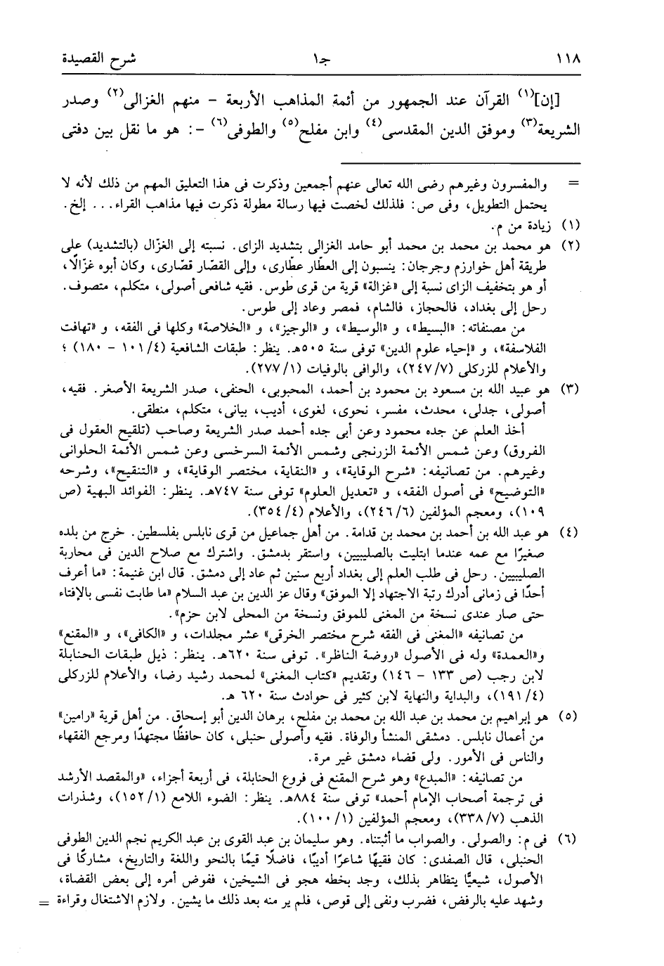(¬4) هو عبد الله بن أحمد بن محمد بن قدامة. من أهل جماعيل من قرى نابلس بفلسطين. خرج من بلده صغيرا مع عمه عند ما ابتليت بالصليبيين، واستقر بدمشق. واشترك مع صلاح الدين فى محاربة الصليبيين. رحل فى طلب العلم إلى بغداد أربع سنين ثم عاد إلى دمشق. قال ابن غنيمة: «ما أعرف أحدا فى زمانى أدرك رتبة الاجتهاد إلا الموفق» وقال عز الدين بن عبد السلام «ما طابت نفسى بالإفتاء حتى صار عندى نسخة من المغنى للموفق ونسخة من المحلى لابن حزم».