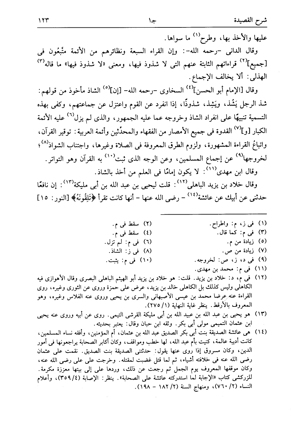 وقال الدانى- رحمه الله-: وإن القراء السبعة ونظائرهم من الأئمة متّبعون فى [جميع] (¬2) قراءاتهم الثابتة عنهم التى لا شذوذ فيها، ومعنى «لا شذوذ فيها» ما قاله (¬3) الهذلى: ألا يخالف الإجماع.