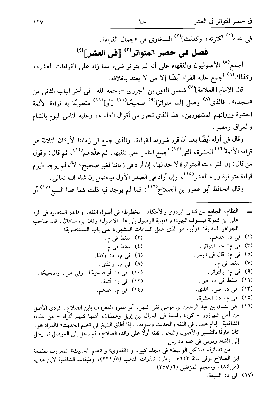 قال الإمام [العلامة] (¬7) شمس الدين بن الجزرى- رحمه الله- فى آخر الباب الثانى من «منجده»: فالذى (¬8) وصل إلينا متواترا (¬9) صحيحا (¬10) [أو] (¬11) مقطوعا به قراءة الأئمة العشرة ورواتهم المشهورين، هذا الذى تحرر من أقوال العلماء، وعليه الناس اليوم بالشام والعراق ومصر.