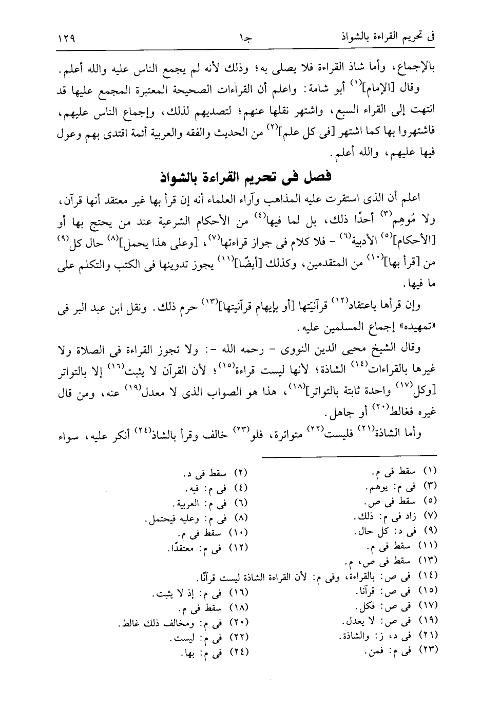 وقال الشيخ محيى الدين النووى- رحمه الله-: ولا تجوز القراءة فى الصلاة ولا غيرها بالقراءات (¬14) الشاذة؛ لأنها ليست قراءة (¬15)؛ لأن القرآن لا يثبت (¬16) إلا بالتواتر [وكل (¬17) واحدة ثابتة بالتواتر] (¬18)، هذا هو الصواب الذى لا معدل (¬19) عنه، ومن قال غيره فغالط (¬20) أو جاهل.