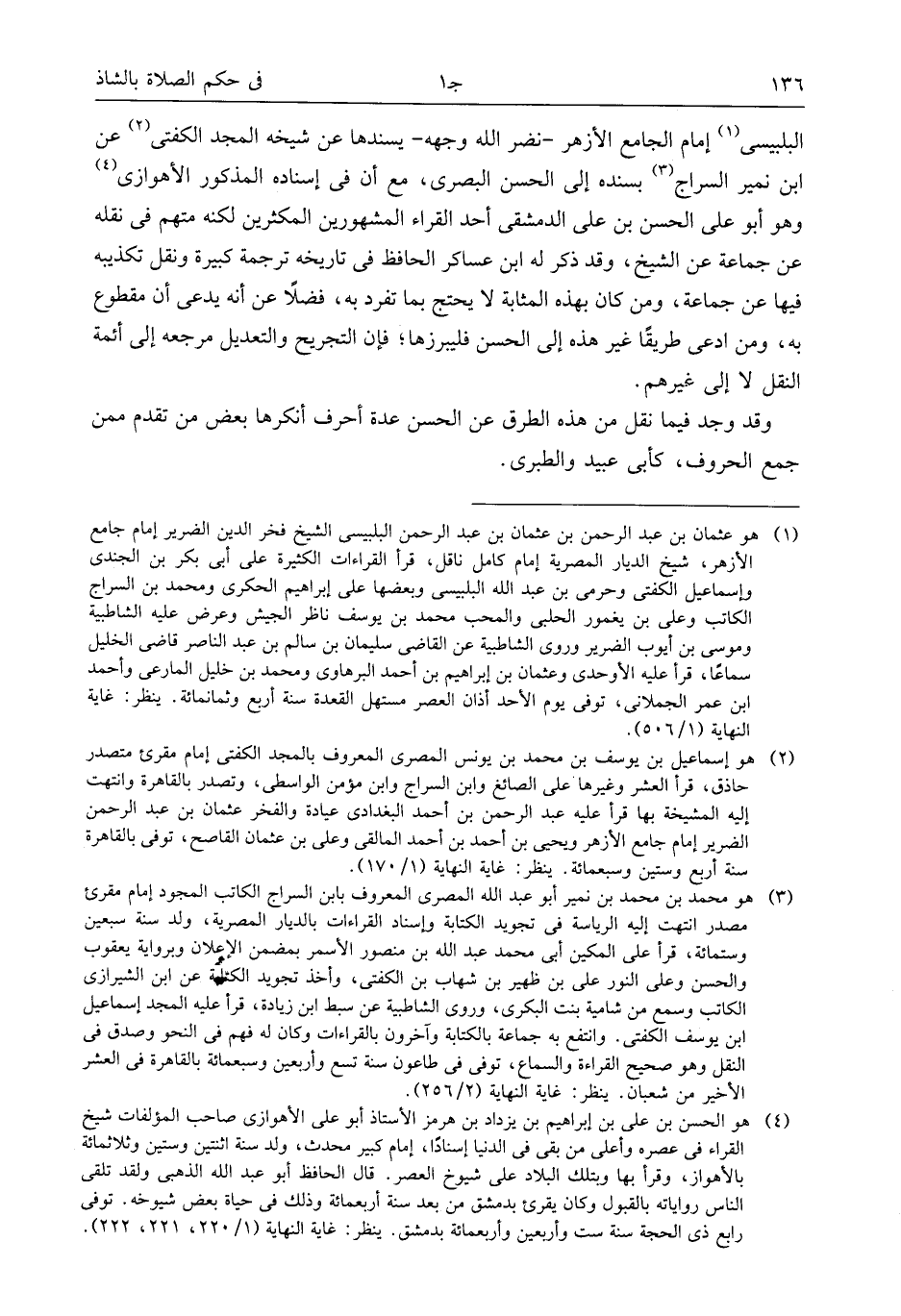 البلبيسى (¬1) إمام الجامع الأزهر- نضر الله وجهه- يسندها عن شيخه المجد الكفتى (¬2) عن ابن نمير السراج (¬3) بسنده إلى الحسن البصرى، مع أن فى إسناده المذكور الأهوازى (¬4) وهو أبو على الحسن بن على الدمشقى أحد القراء المشهورين المكثرين لكنه متهم فى نقله عن جماعة عن الشيخ، وقد ذكر له ابن عساكر الحافظ فى تاريخه ترجمة كبيرة ونقل تكذيبه فيها عن جماعة، ومن كان بهذه المثابة لا يحتج بما تفرد به، فضلا عن أنه يدعى أن مقطوع به، ومن ادعى طريقا غير هذه إلى الحسن فليبرزها؛ فإن التجريح والتعديل مرجعه إلى أئمة النقل لا إلى غيرهم.