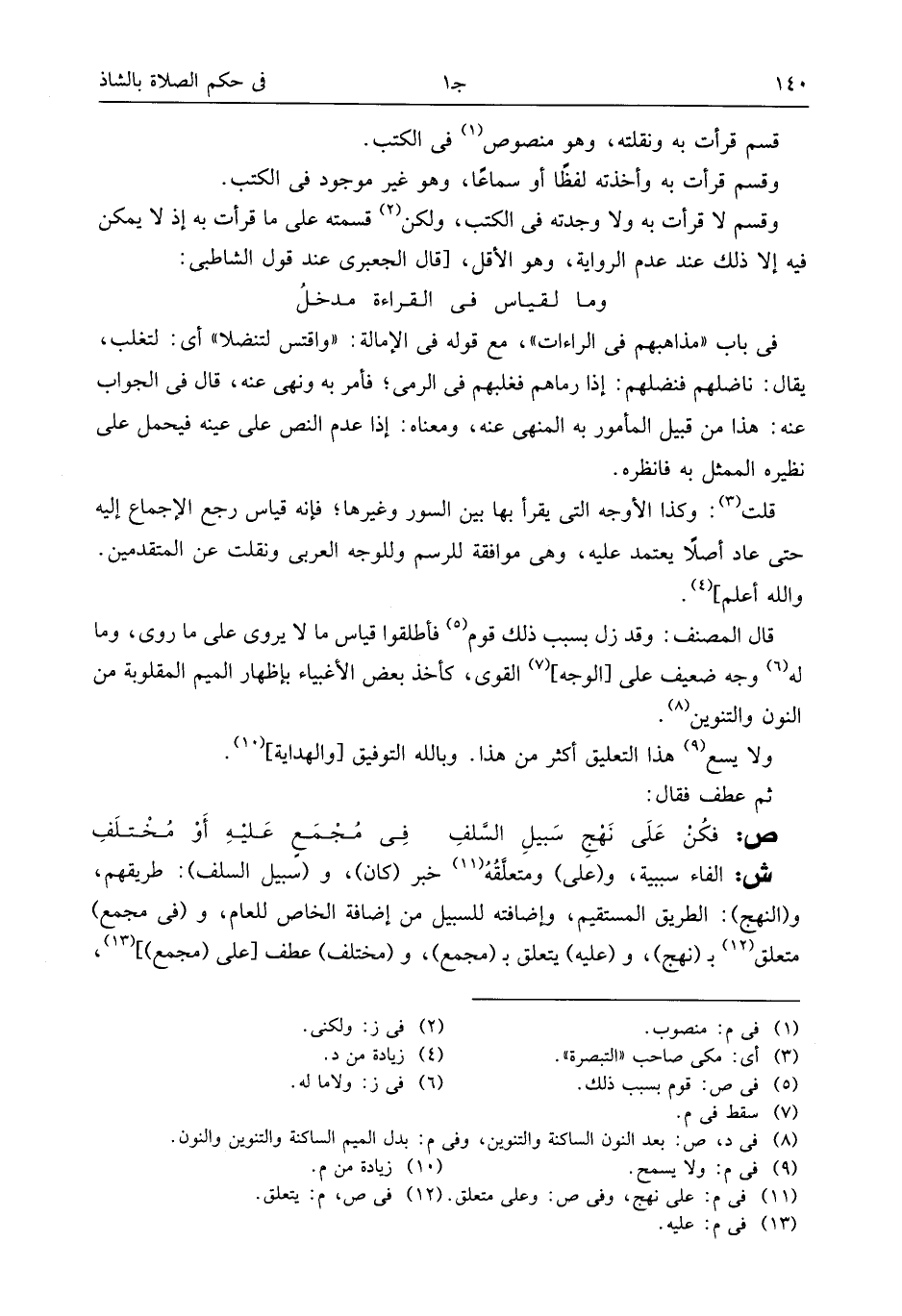 ش: الفاء سببية، و (على) ومتعلّقه (¬11) خبر (كان)، و (سبيل السلف): طريقهم، و (النهج): الطريق المستقيم، وإضافته للسبيل من إضافة الخاص للعام، و (فى مجمع) متعلق (¬12) ب (نهج)، و (عليه) يتعلق ب (مجمع)، و (مختلف) عطف [على (مجمع)] (¬13)،