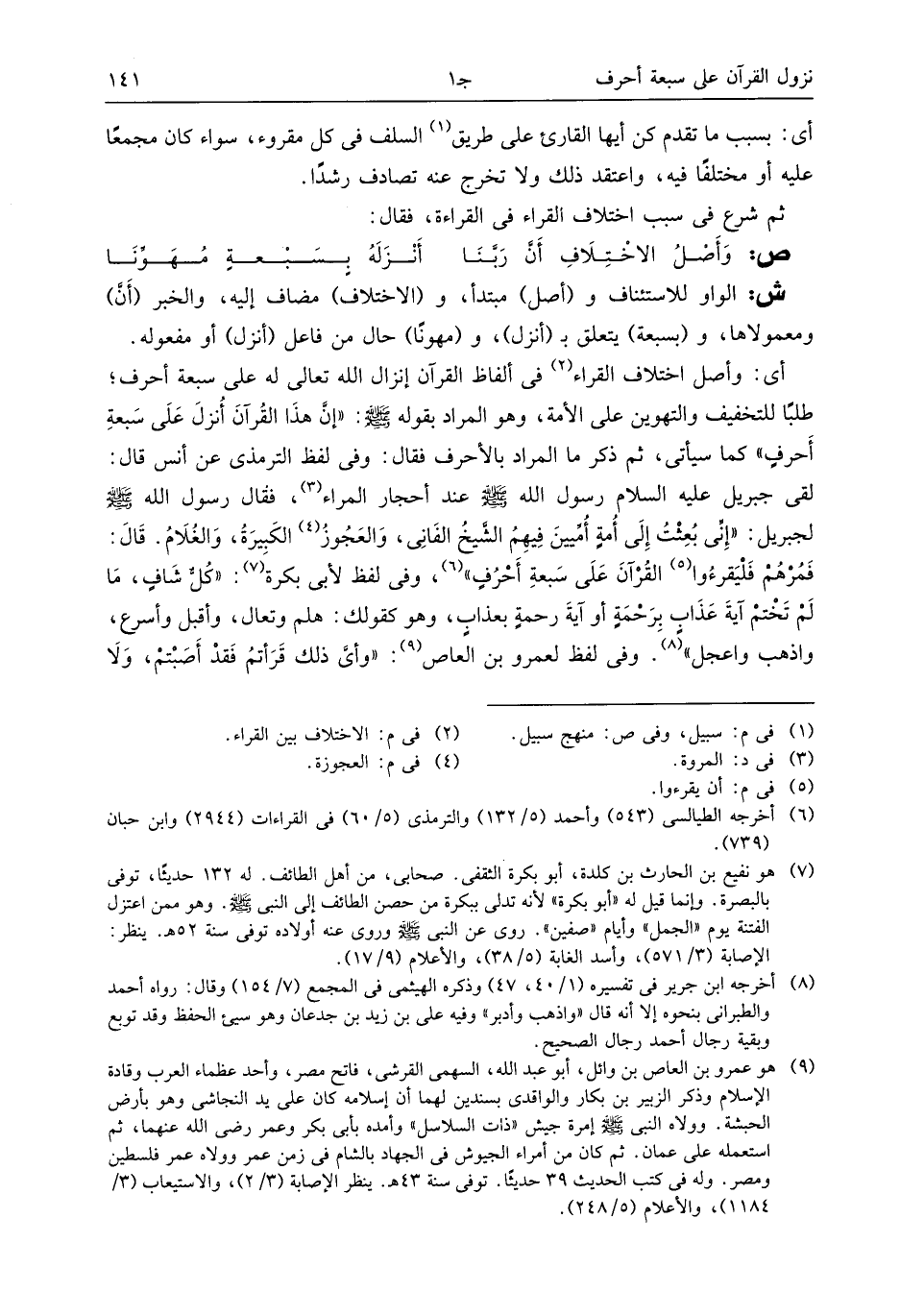 فمرهم فليقرءوا (¬5) القرآن على سبعة أحرف» (¬6)، وفى لفظ لأبى بكرة (¬7): «كلّ شاف، ما لم تختم آية عذاب برحمة أو آية رحمة بعذاب، وهو كقولك: هلم وتعال، وأقبل وأسرع، واذهب واعجل» (¬8). وفى لفظ لعمرو بن العاص (¬9): «وأىّ ذلك قرأتم فقد أصبتم، ولا