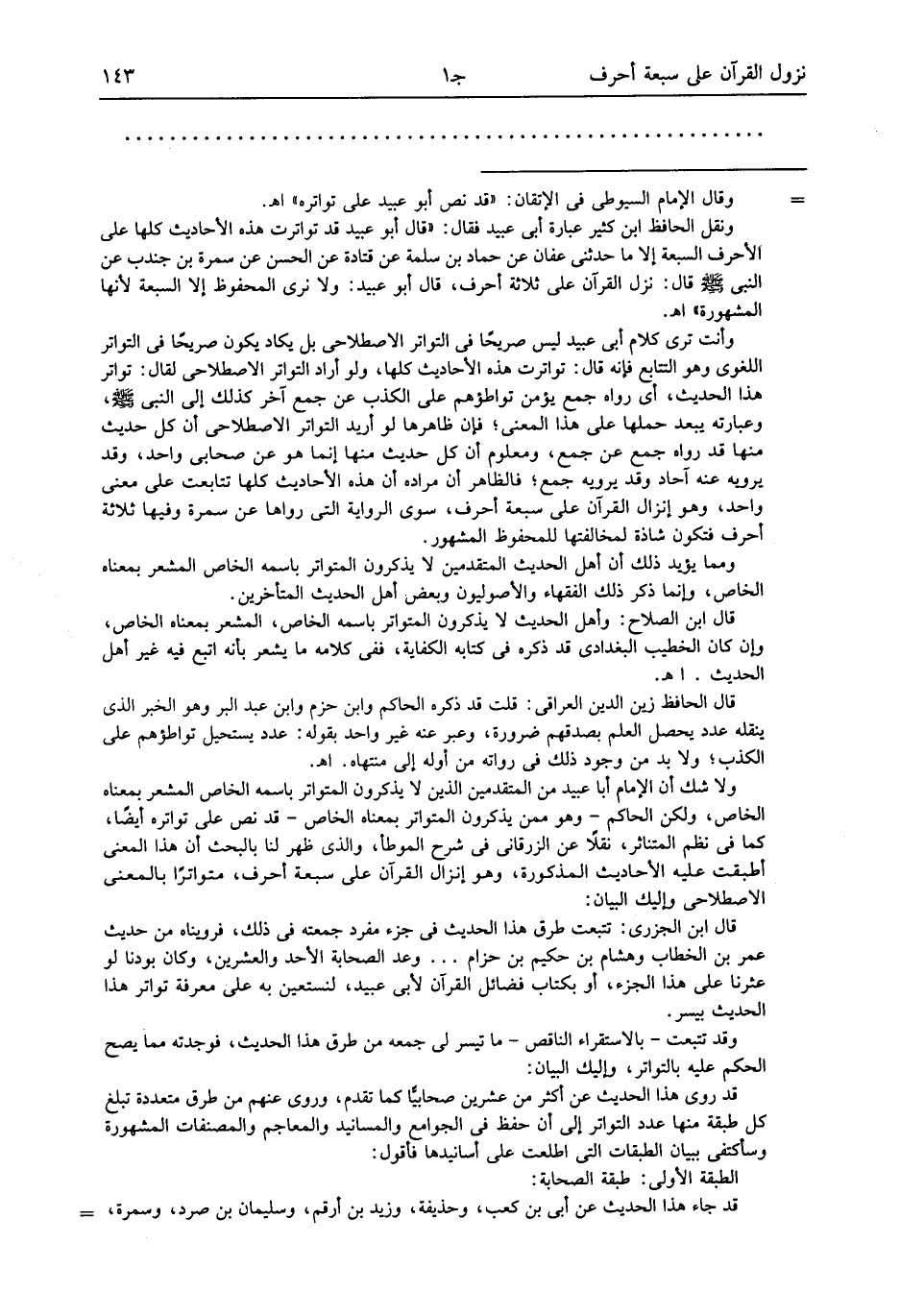 ولا شك أن الإمام أبا عبيد من المتقدمين الذين لا يذكرون المتواتر باسمه الخاص المشعر بمعناه الخاص، ولكن الحاكم- وهو ممن يذكرون المتواتر بمعناه الخاص- قد نص على تواتره أيضا، كما فى نظم المتناثر، نقلا عن الزرقانى فى شرح الموطأ، والذى ظهر لنا بالبحث أن هذا المعنى أطبقت عليه الأحاديث المذكورة، وهو إنزال القرآن على سبعة أحرف، متواترا بالمعنى الاصطلاحى وإليك البيان: