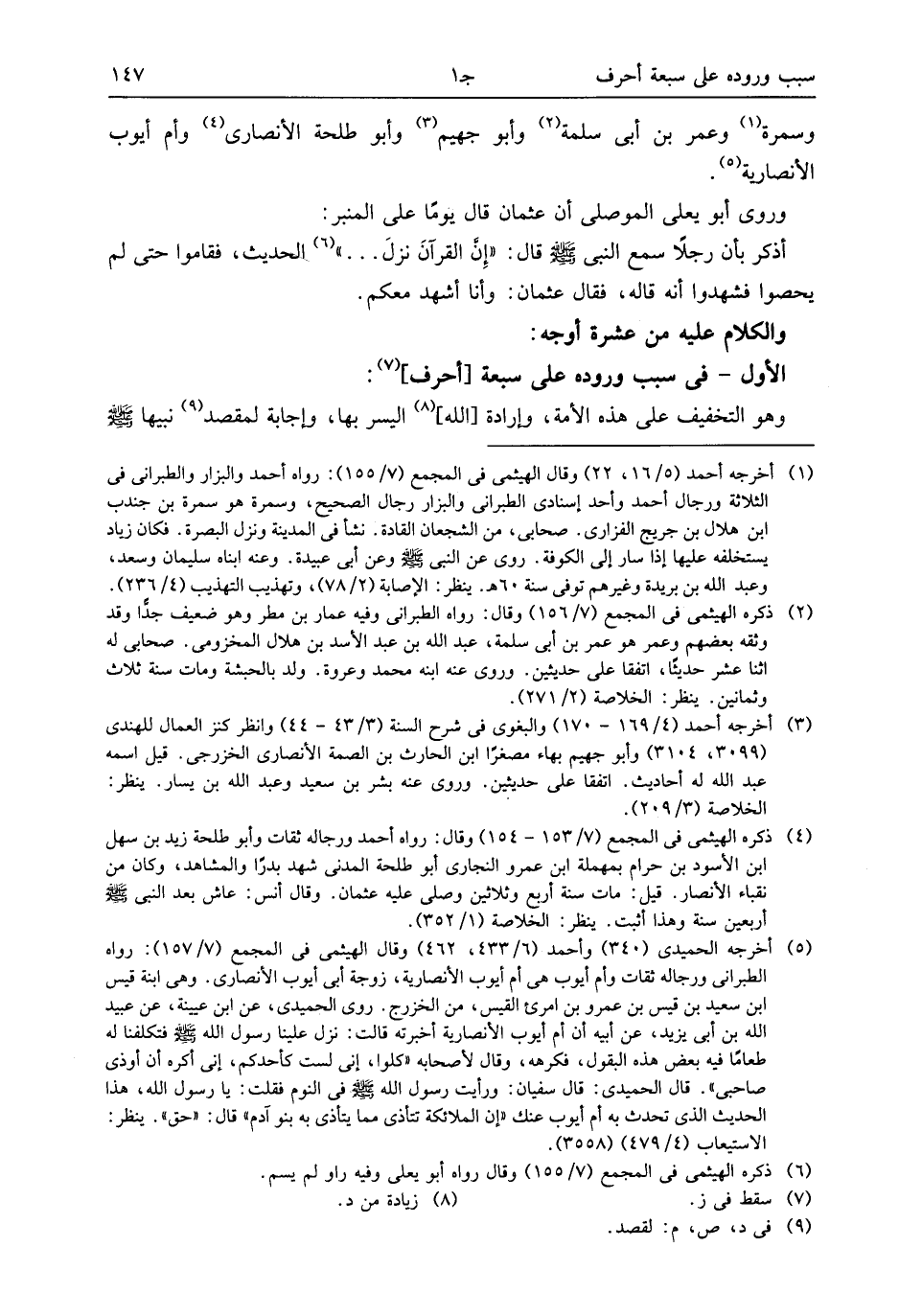 أذكر بأن رجلا سمع النبى صلى الله عليه وسلم قال: «إنّ القرآن نزل ... » (¬6) الحديث، فقاموا حتى لم يحصوا فشهدوا أنه قاله، فقال عثمان: وأنا أشهد معكم.
