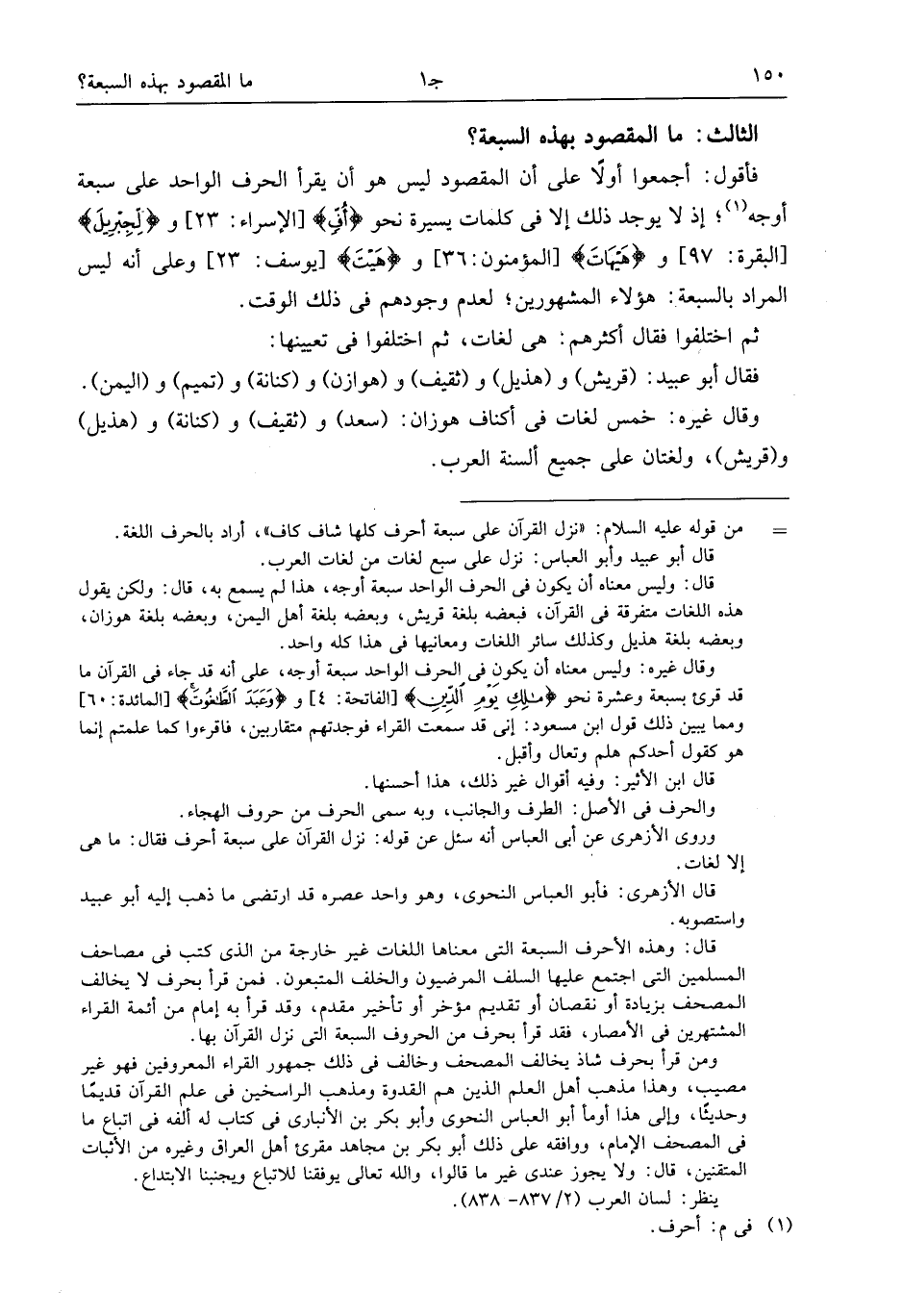 قال: وليس معناه أن يكون فى الحرف الواحد سبعة أوجه، هذا لم يسمع به، قال: ولكن يقول هذه اللغات متفرقة فى القرآن، فبعضه بلغة قريش، وبعضه بلغة أهل اليمن، وبعضه بلغة هوازن، وبعضه بلغة هذيل وكذلك سائر اللغات ومعانيها فى هذا كله واحد.