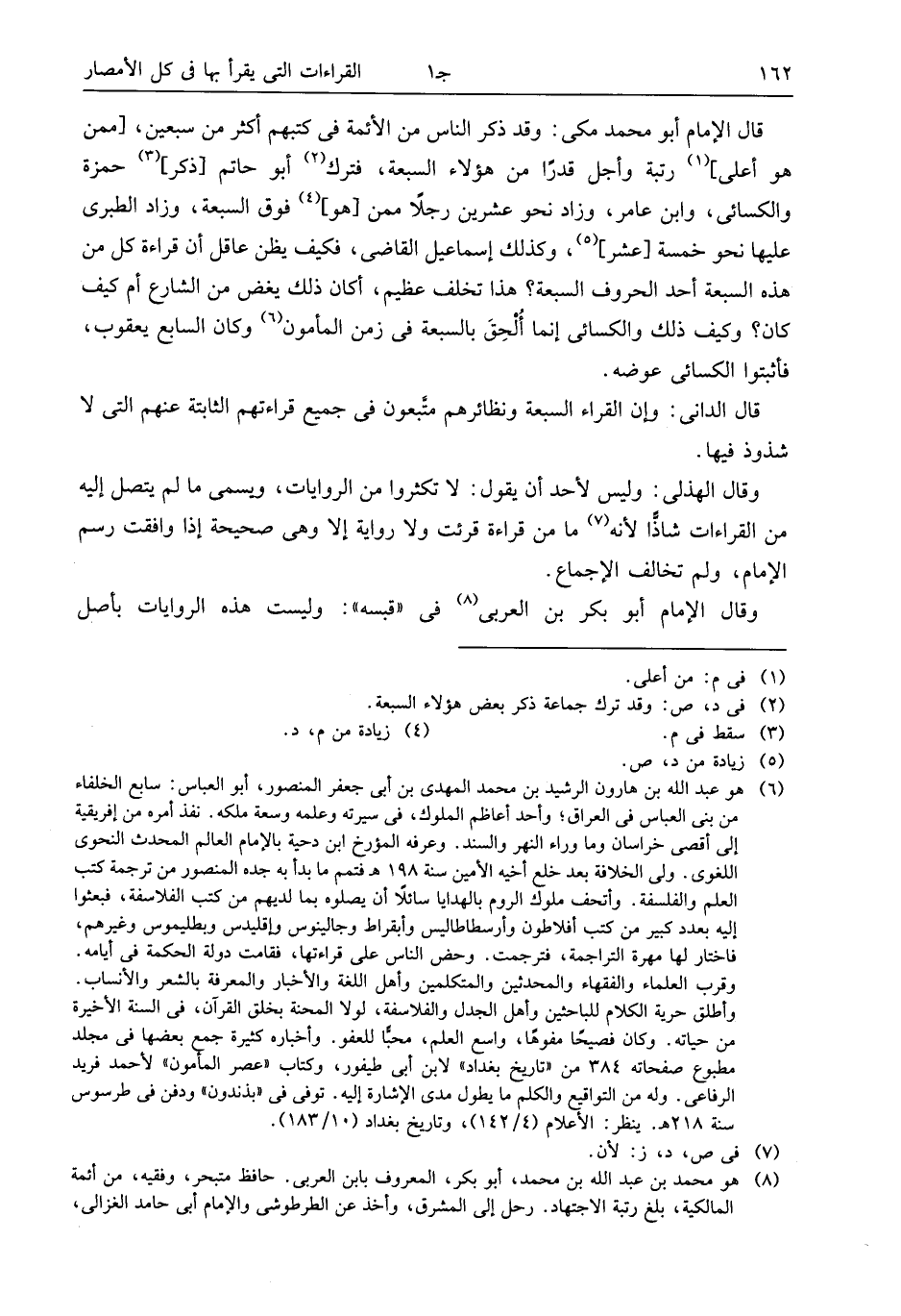 قال الإمام أبو محمد مكى: وقد ذكر الناس من الأئمة فى كتبهم أكثر من سبعين، [ممن هو أعلى] (¬1) رتبة وأجل قدرا من هؤلاء السبعة، فترك (¬2) أبو حاتم [ذكر] (¬3) حمزة والكسائى، وابن عامر، وزاد نحو عشرين رجلا ممن [هو] (¬4) فوق السبعة، وزاد الطبرى عليها نحو خمسة [عشر] (¬5)، وكذلك إسماعيل القاضى، فكيف يظن عاقل أن قراءة كل من هذه السبعة أحد الحروف السبعة؟ هذا تخلف عظيم، أكان ذلك يغض من الشارع أم كيف كان؟ وكيف ذلك والكسائى إنما ألحق بالسبعة فى زمن المأمون (¬6) وكان السابع يعقوب، فأثبتوا الكسائى عوضه.