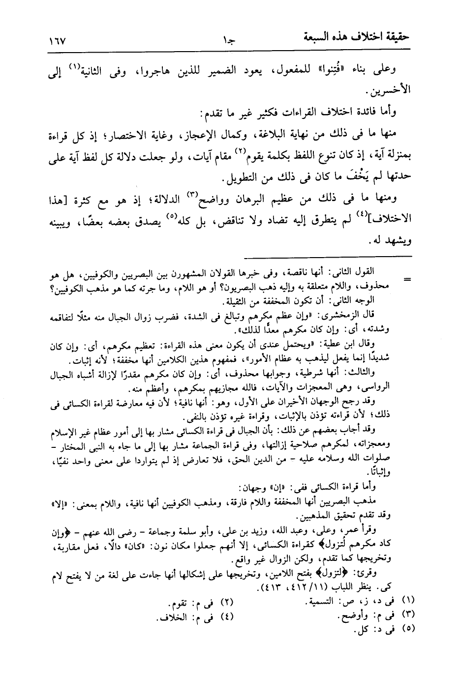 منها ما فى ذلك من نهاية البلاغة، وكمال الإعجاز، وغاية الاختصار؛ إذ كل قراءة بمنزلة آية، إذ كان تنوع اللفظ بكلمة يقوم (¬2) مقام آيات، ولو جعلت دلالة كل لفظ آية على حدتها لم يخف ما كان فى ذلك من التطويل.