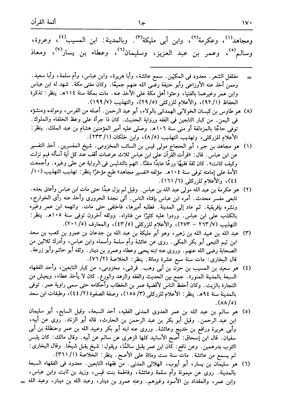 ومجاهد (¬1)، وعكرمة (¬2)، وابن أبى مليكة (¬3). وبالمدينة: ابن المسيب (¬4)، وعروة، وسالم (¬5)، وعمر بن عبد العزيز، وسليمان (¬6)، وعطاء بن يسار (¬7)، ومعاذ