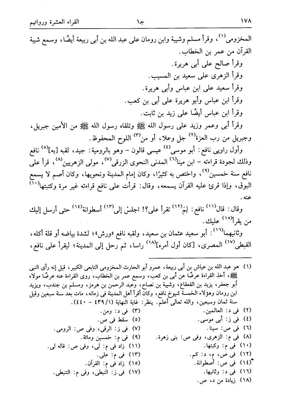 (¬1) هو عبد الله بن عياش بن أبى ربيعة، عمرو أبو الحارث المخزومى التابعى الكبير، قيل إنه رأى النبى صلى الله عليه وسلم، أخذ القراءة عرضا عن أبى بن كعب، وسمع عمر بن الخطاب، روى القراءة عنه عرضا مولاه أبو جعفر، يزيد بن القعقاع، وشيبة بن نصاح، وعبد الرحمن بن هرمز، ومسلم بن جندب، ويزيد ابن رومان وهؤلاء الخمسة شيوخ نافع، وكان أقرأ أهل المدينة فى زمانه، مات بعد سنة سبعين وقيل سنة ثمان وسبعين، والله تعالى أعلم. ينظر: غاية النهاية (1/ 439 - 440).