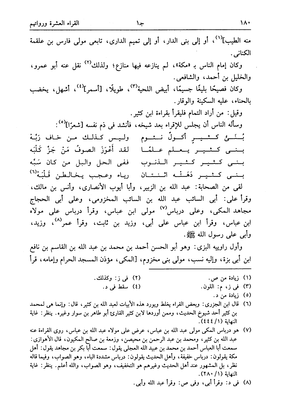(¬6) قال ابن الجزرى: وبعض القراء يغلط ويورد هذه الأبيات لعبد الله بن كثير، قال: وإنما هى لمحمد بن كثير أحد شيوخ الحديث، وممن أوردها لابن كثير القارئ أبو طاهر بن سوار وغيره. ينظر: غاية النهاية (1/ 444).