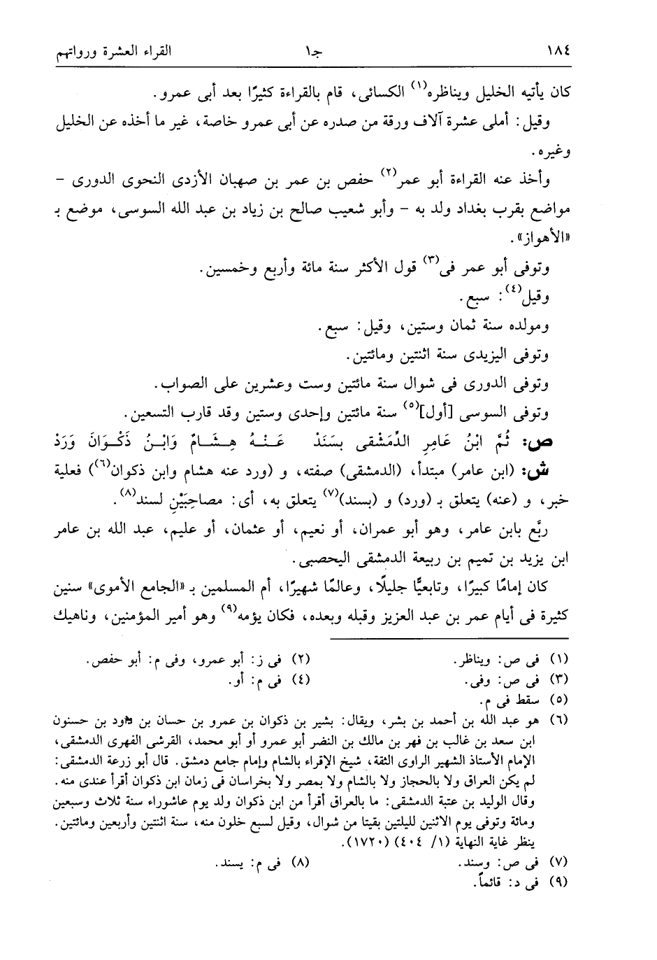 (¬6) هو عبد الله بن أحمد بن بشر، ويقال: بشير بن ذكوان بن عمرو بن حسان بن داود بن حسنون ابن سعد بن غالب بن فهر بن مالك بن النضر أبو عمرو أو أبو محمد، القرشى الفهرى الدمشقى، الإمام الأستاذ الشهير الراوى الثقة، شيخ الإقراء بالشام وإمام جامع دمشق. قال أبو زرعة الدمشقى: