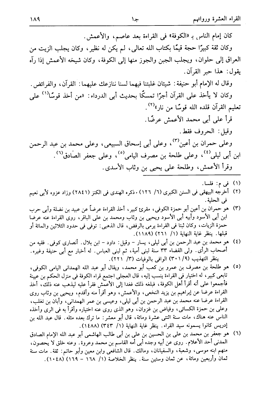 (¬3) هو حمران بن أعين أبو حمزة الكوفى، مقرئ كبير، أخذ القراءة عرضا عن عبيد بن نضلة وأبى حرب ابن أبى الأسود وأبيه أبى الأسود ويحيى بن وثاب ومحمد بن على الباقر، روى القراءة عنه عرضا حمزة الزيات، وكان ثبتا فى القراءة يرمى بالرفض، قال الذهبى: توفى فى حدود الثلاثين والمائة أو قبلها. ينظر غاية النهاية (1/ 261) (1189).