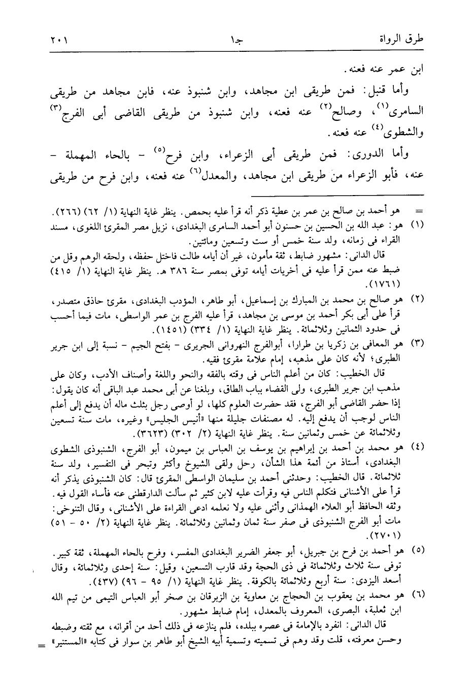 (¬4) هو محمد بن أحمد بن إبراهيم بن يوسف بن العباس بن ميمون، أبو الفرج، الشنبوذى الشطوى البغدادى، أستاذ من أئمة هذا الشأن، رحل ولقى الشيوخ وأكثر وتبحر فى التفسير، ولد سنة ثلاثمائة. قال الخطيب: وحدثنى أحمد بن سليمان الواسطى المقرئ قال: كان الشنبوذى يذكر أنه قرأ على الأشنانى فتكلم الناس فيه وقرأت عليه لابن كثير ثم سألت الدار قطنى عنه فأساء القول فيه.