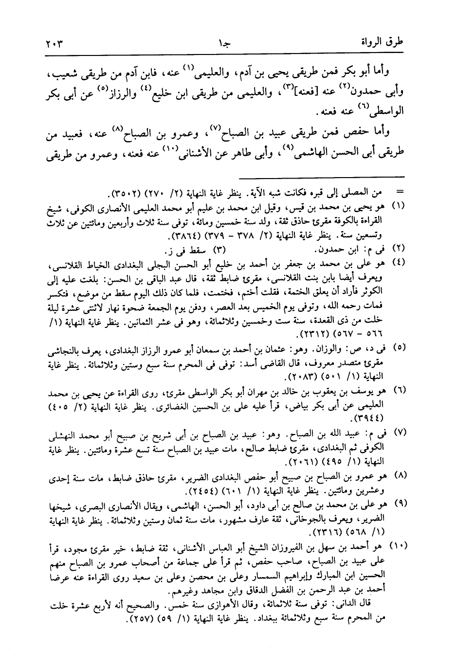 (¬10) هو أحمد بن سهل بن الفيروزان الشيخ أبو العباس الأشنانى، ثقة ضابط، خير مقرئ مجود، قرأ على عبيد بن الصباح، صاحب حفص، ثم قرأ على جماعة من أصحاب عمرو بن الصباح منهم الحسين ابن المبارك وإبراهيم السمسار وعلى بن محصن وعلى بن سعيد روى القراءة عنه عرضا أحمد بن عبد الرحمن بن الفضل الدقاق وابن مجاهد وغيرهم.